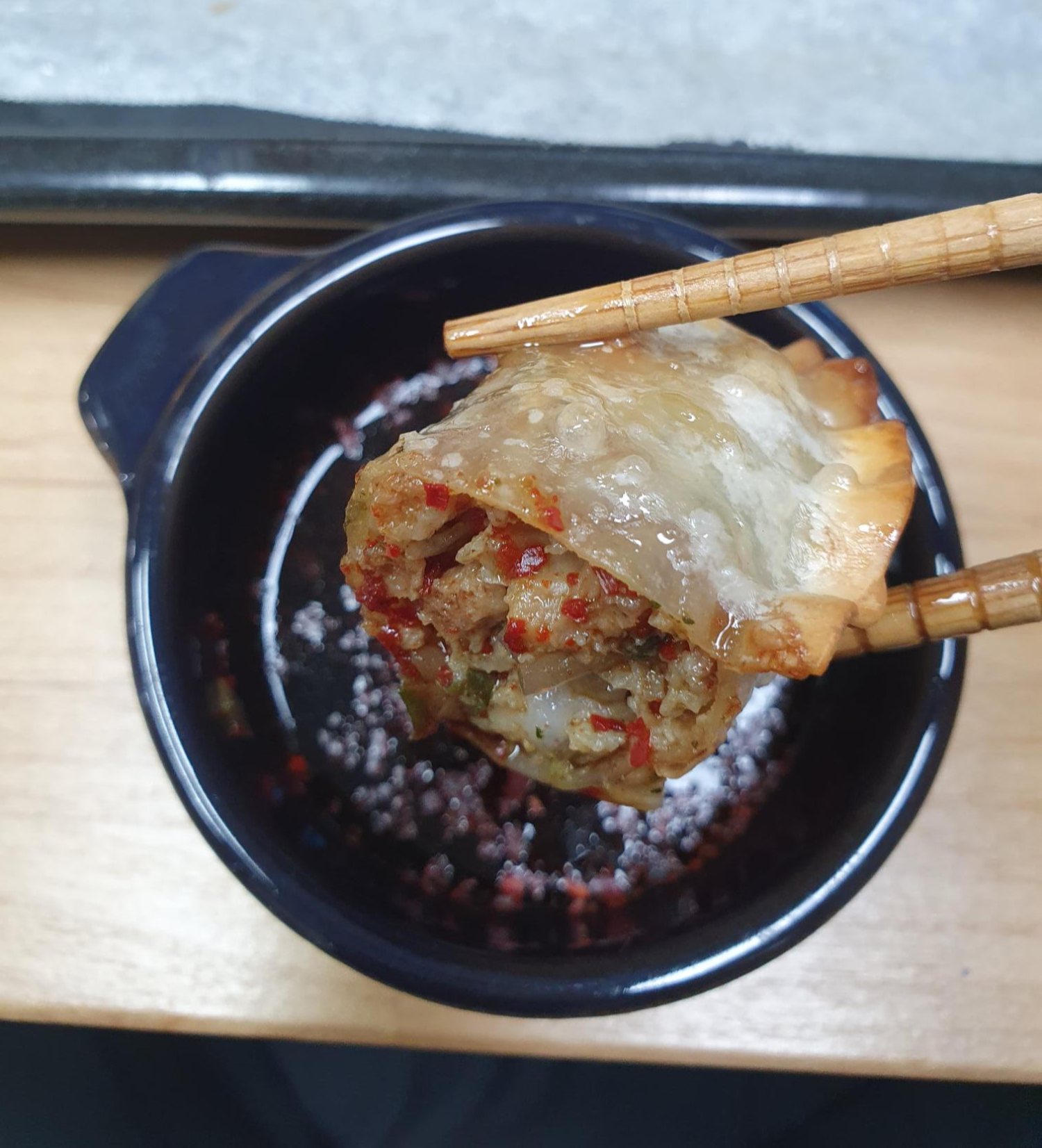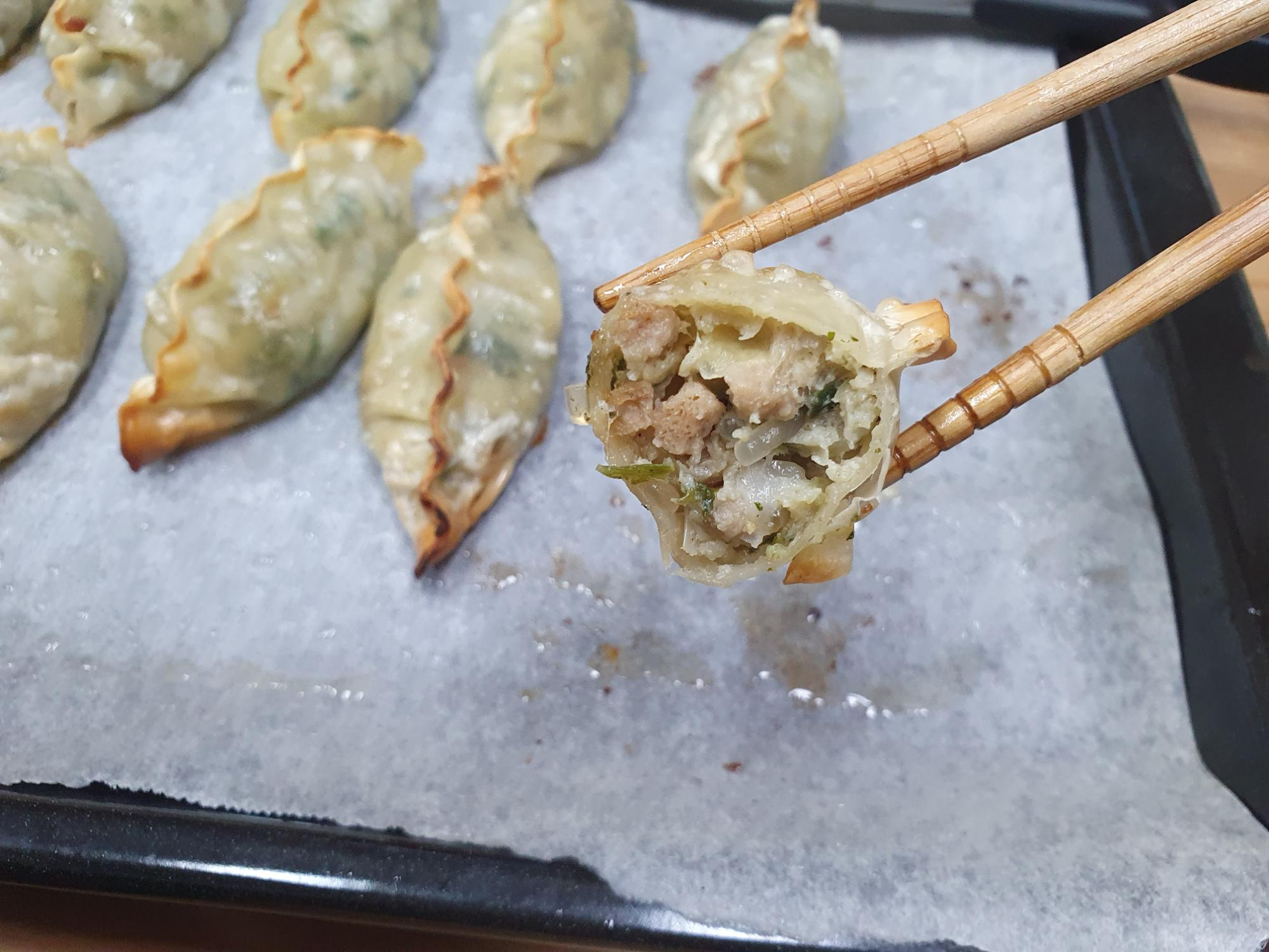 실제로 팬에 군만두 조리한것 보다 더 바삭하고 기름기는 없어서 담백한것 같아요.