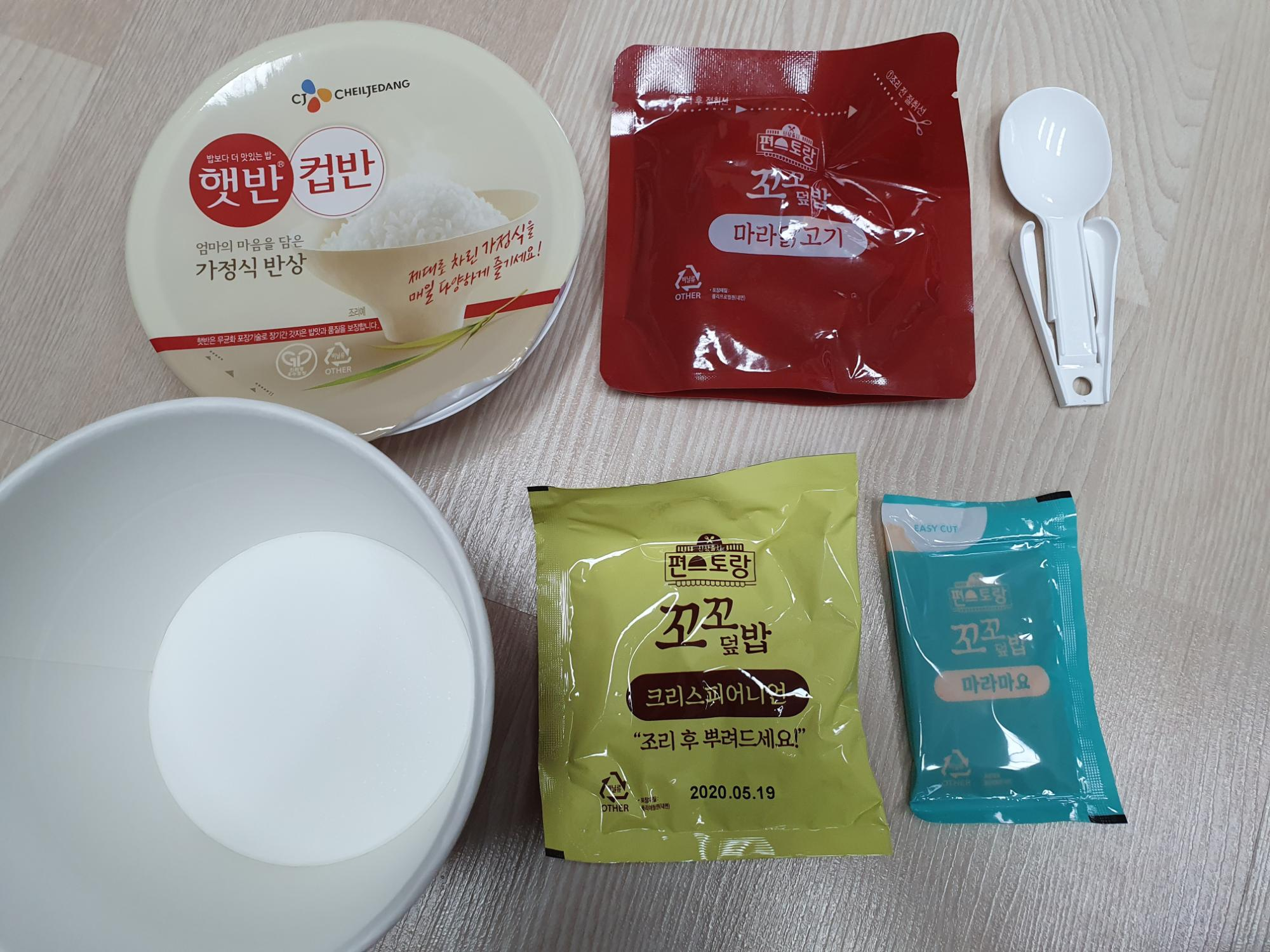 구성품은 햇반, 마라 닭고기, 크리스피 어니언, 마라마요 그리고 숟가락이 포함되어있습니다.