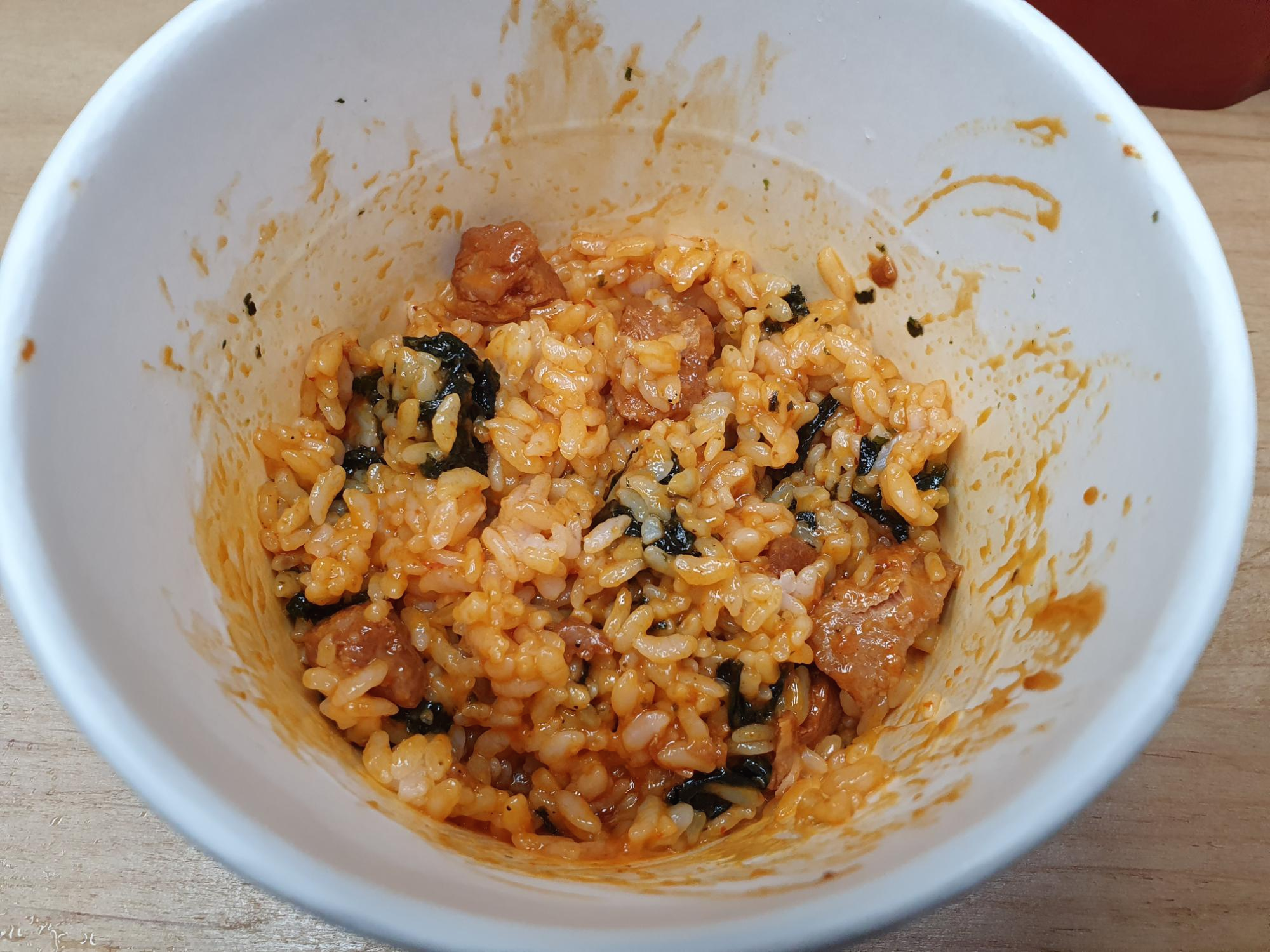 2. 컵 용기에 햇반과 마라 닭고기, 마라마 요를 넣고 비벼줍니다.