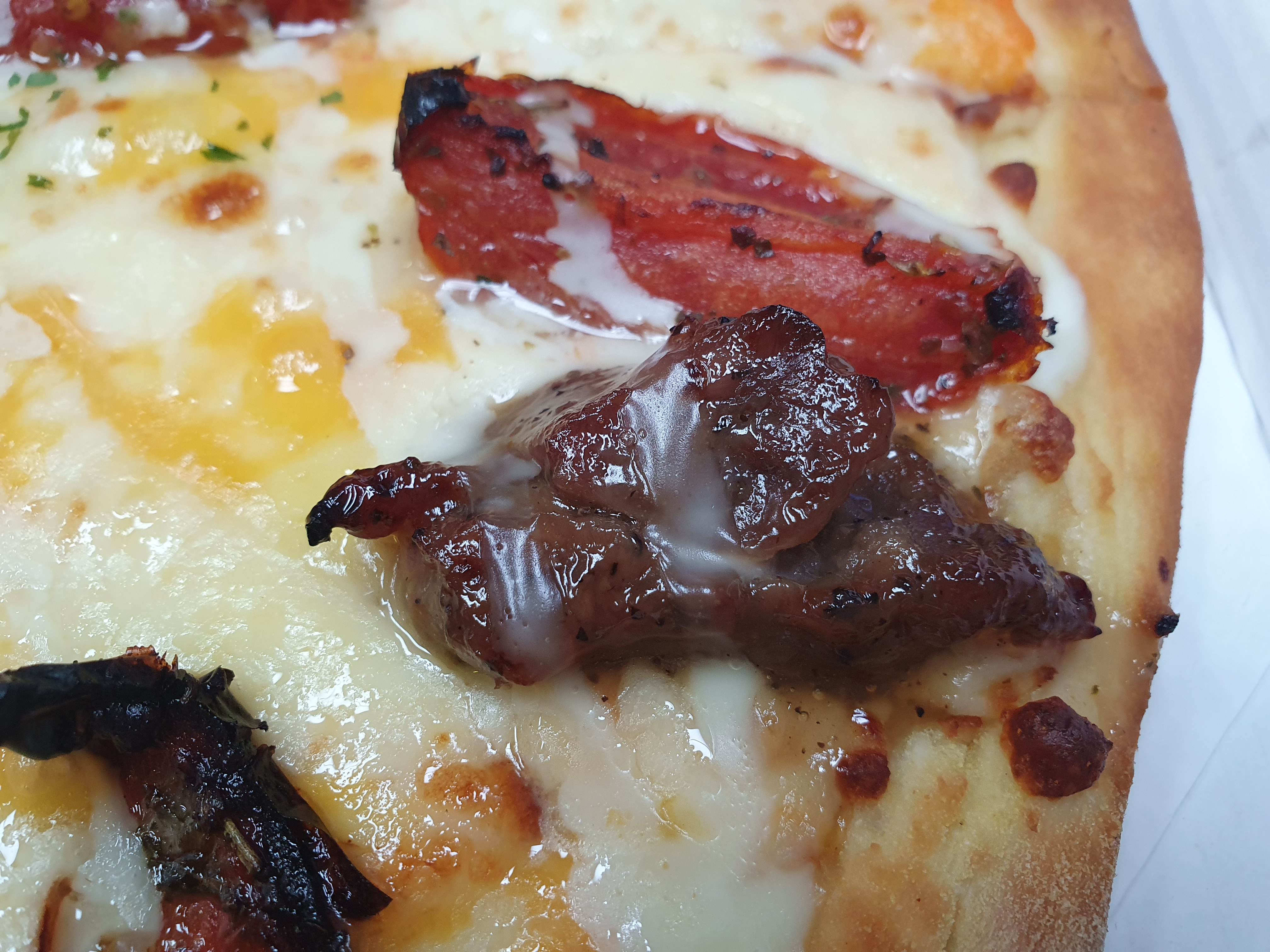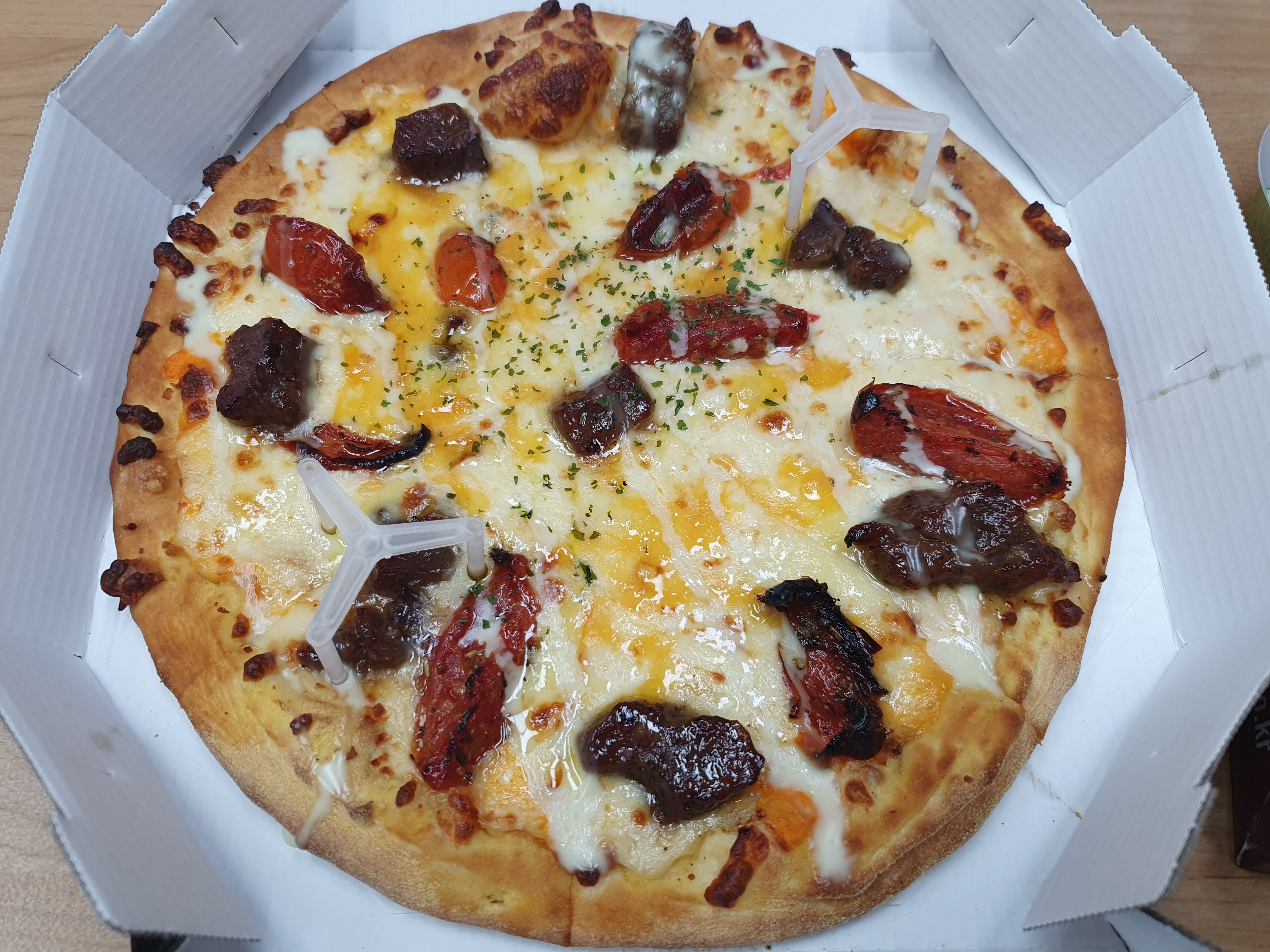 30치즈 뉴욕 스트립 스테이크 피자를 포장 주문해왔습니다.