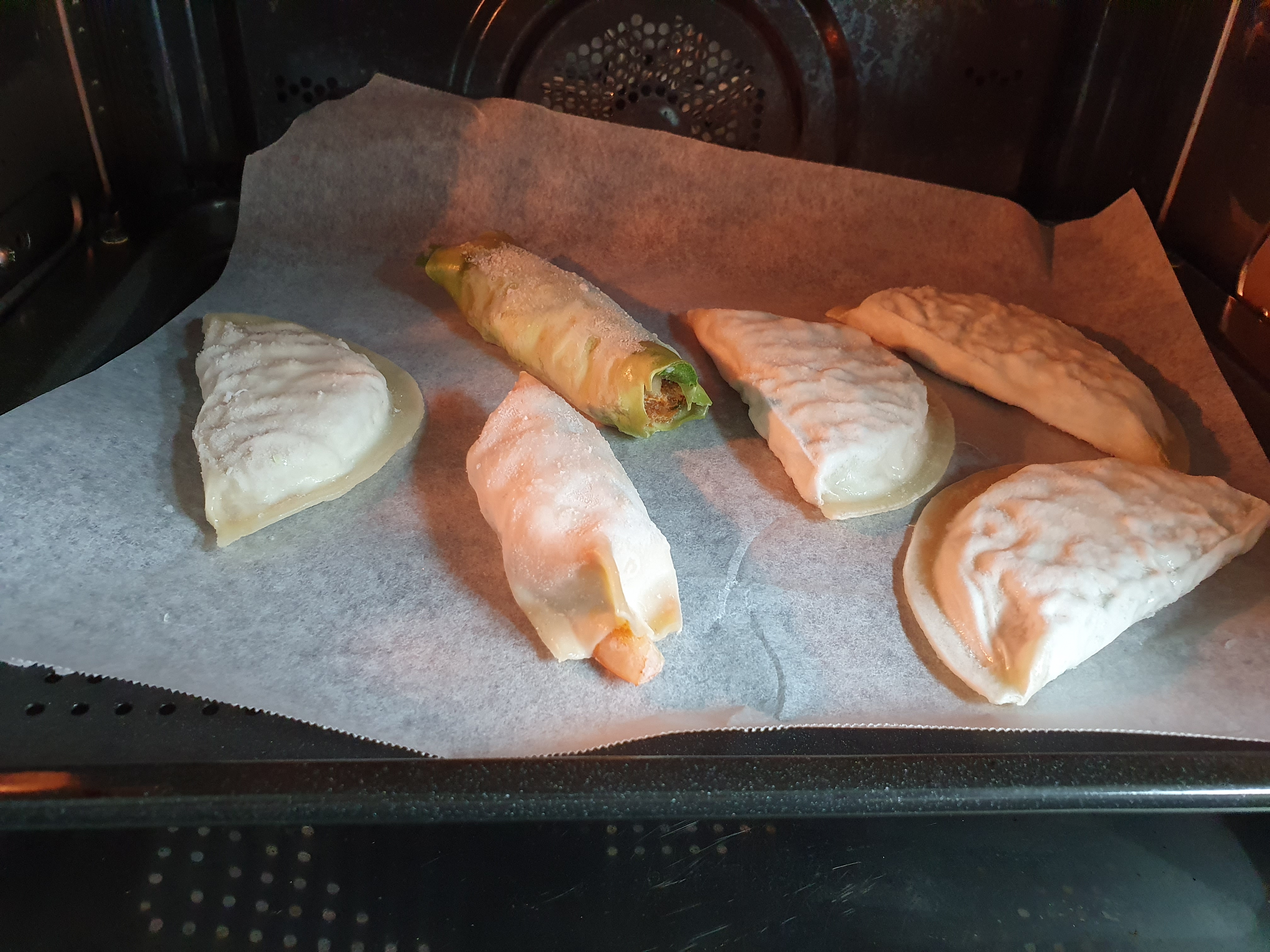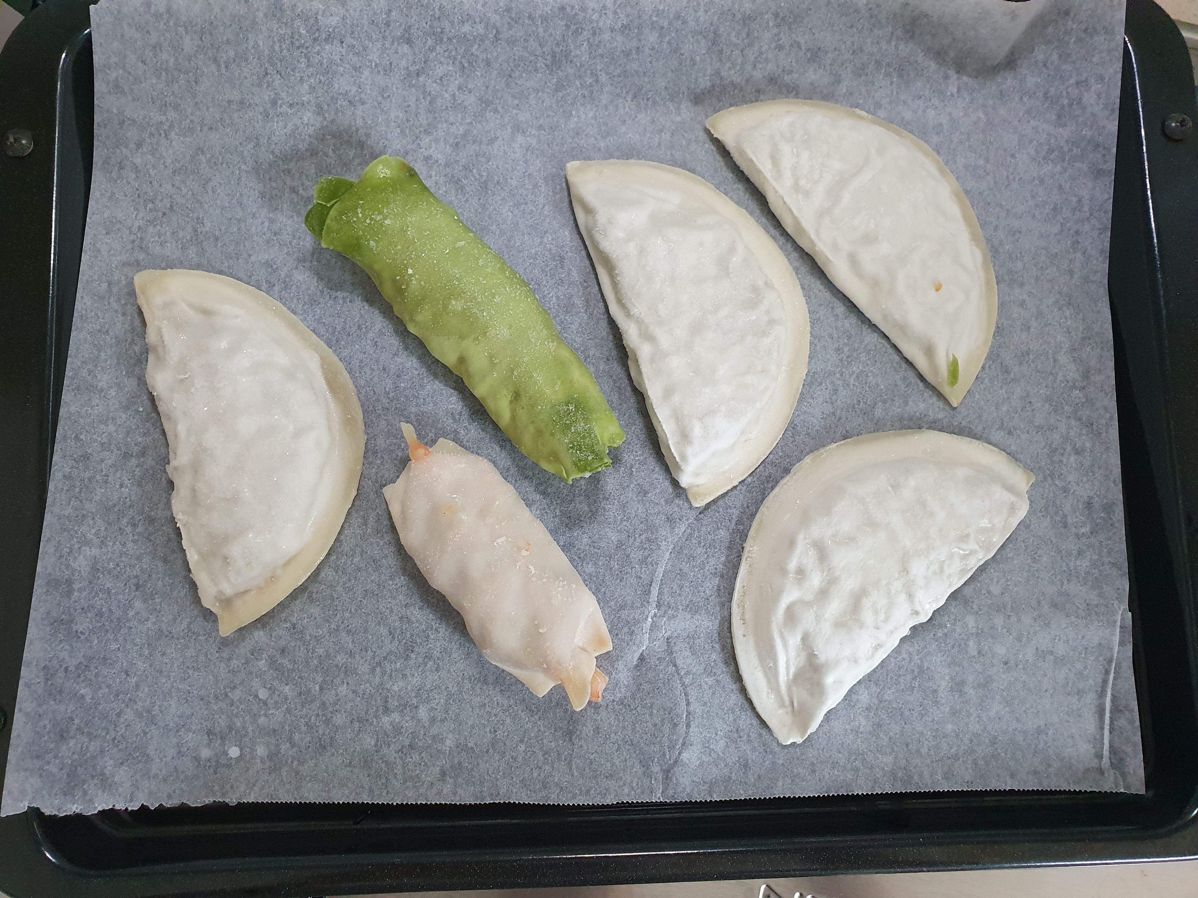 종이 포일을 깔고 만두 위에 기름을 발라서 오븐레인지에 구울 준비를 했어요.