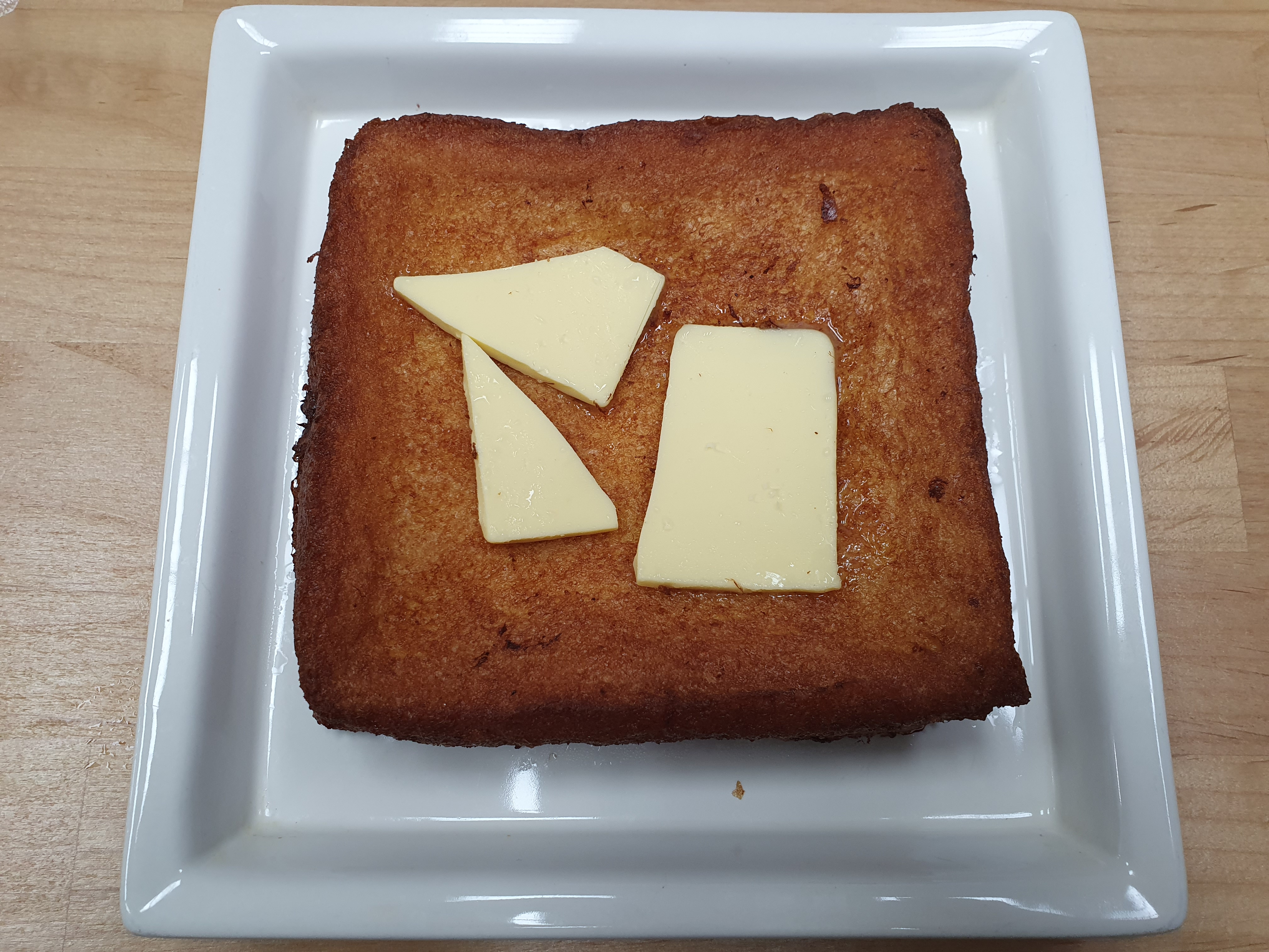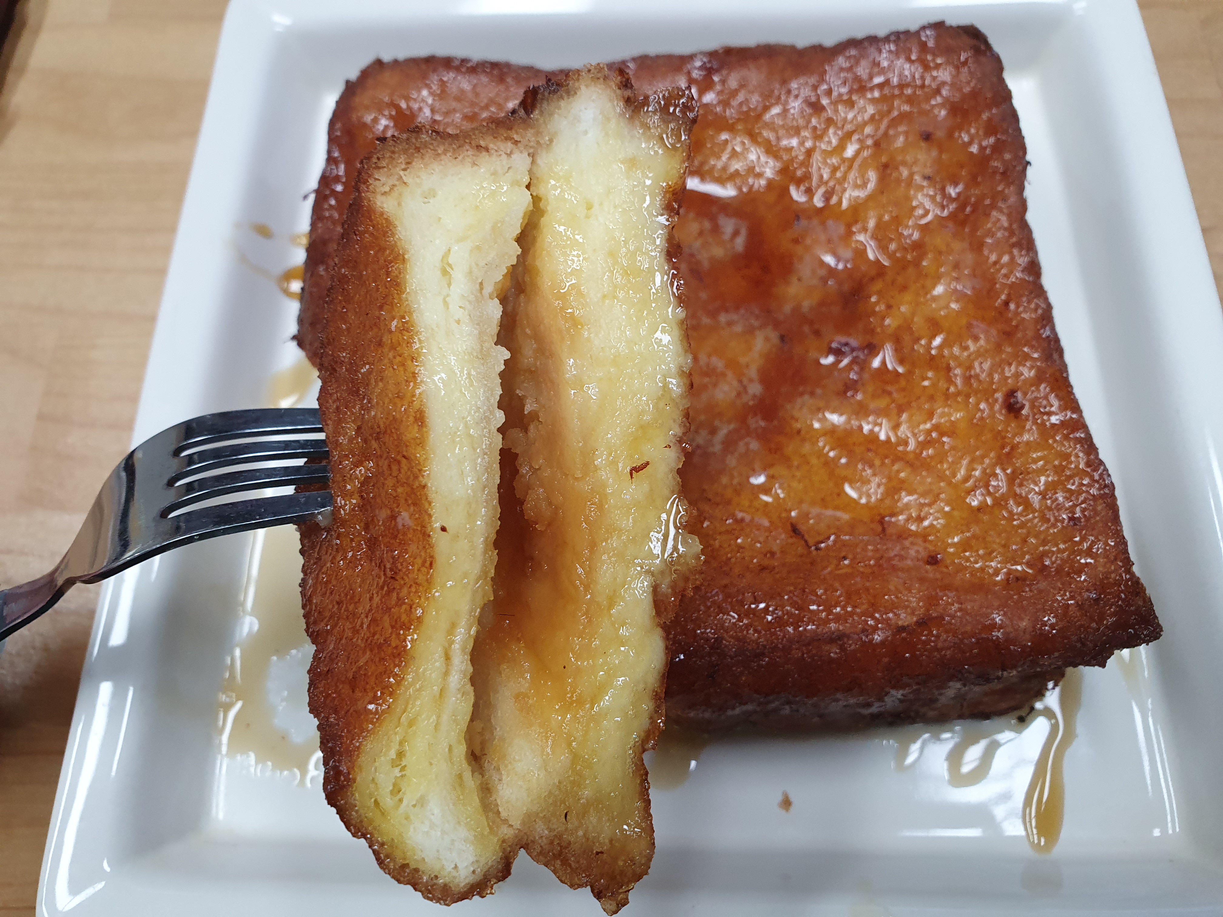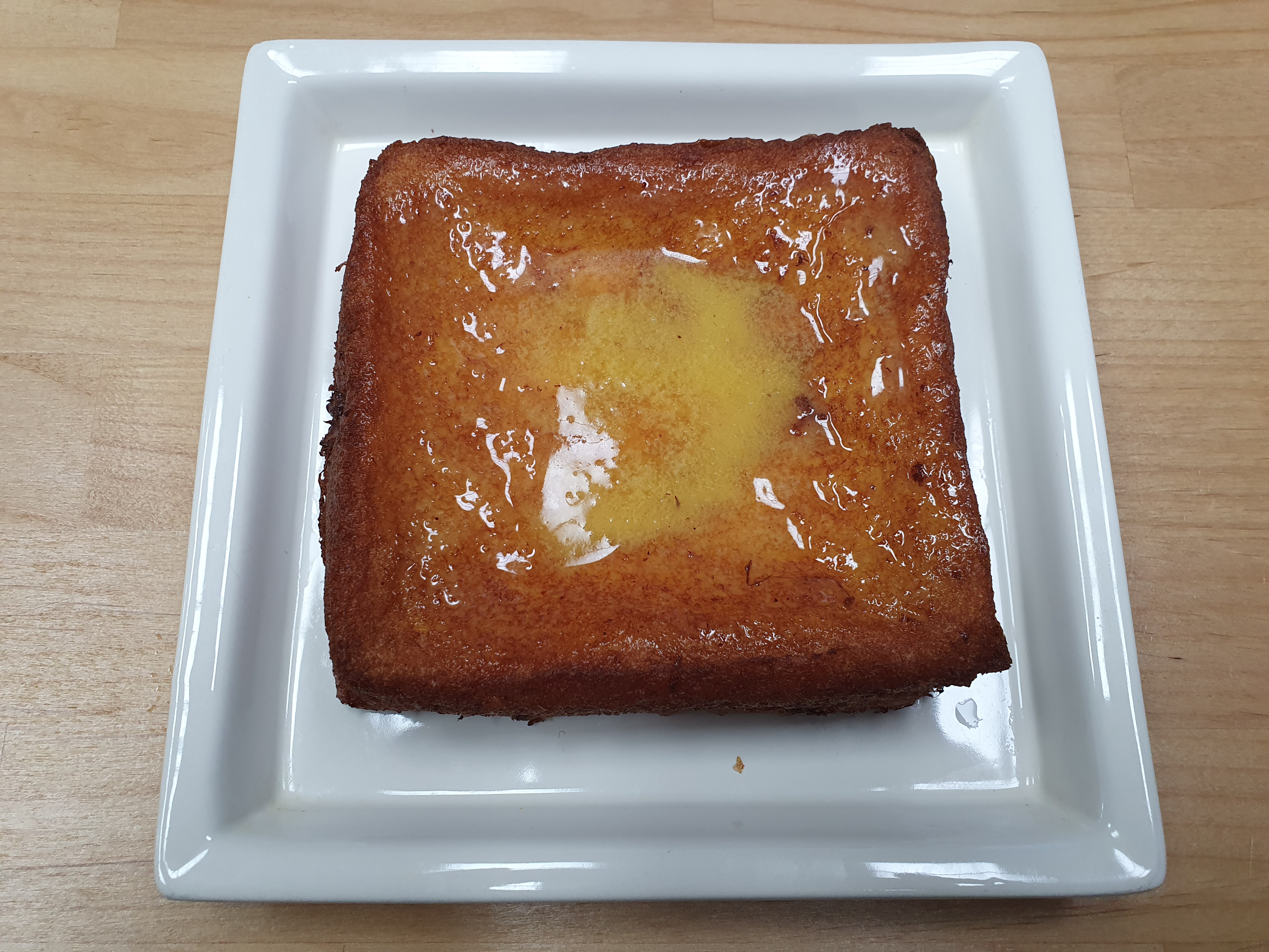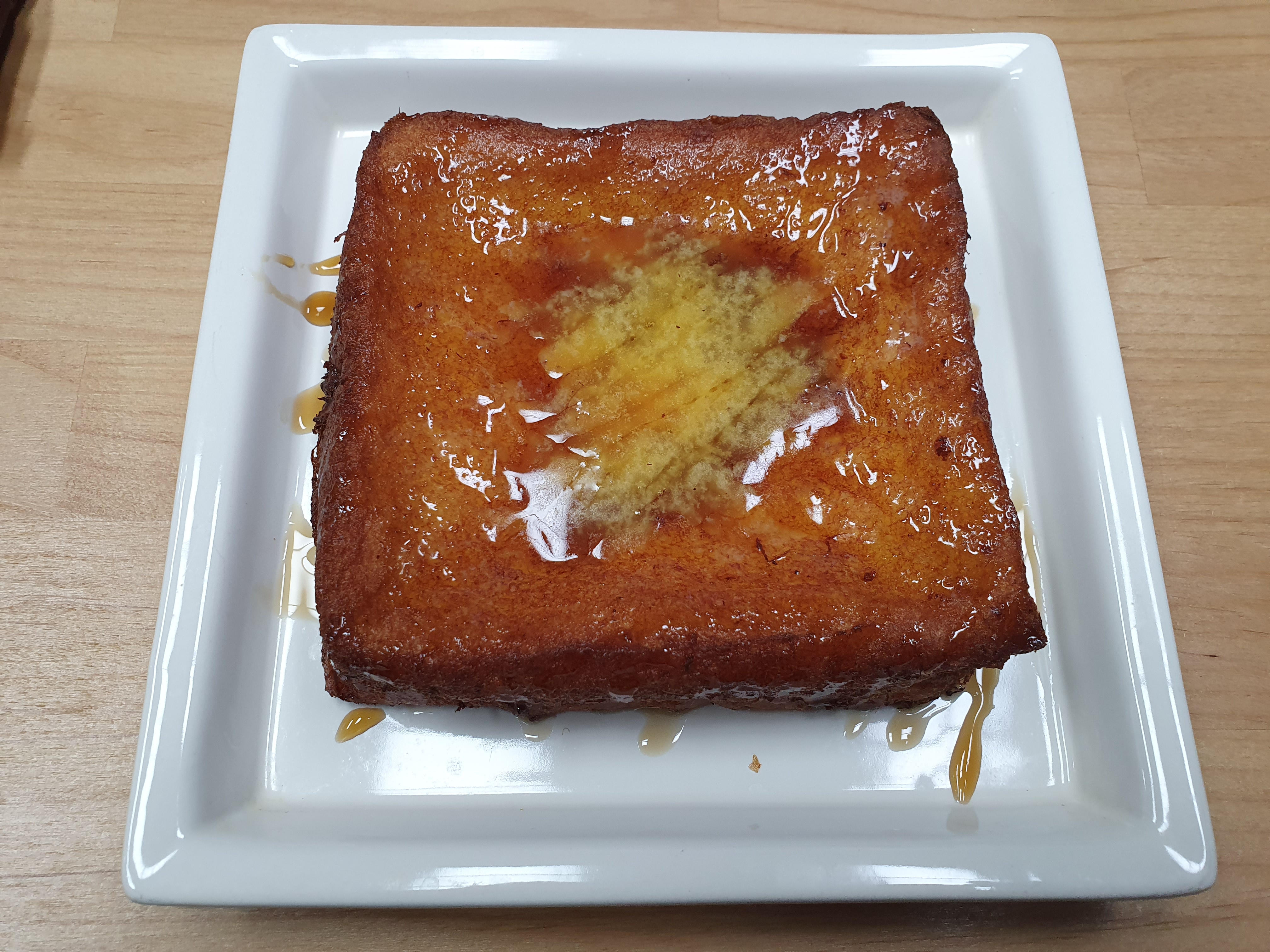 계란물에 담가서 구운 식빵에 버터를 올리고 메이플 시럽을 뿌린,
