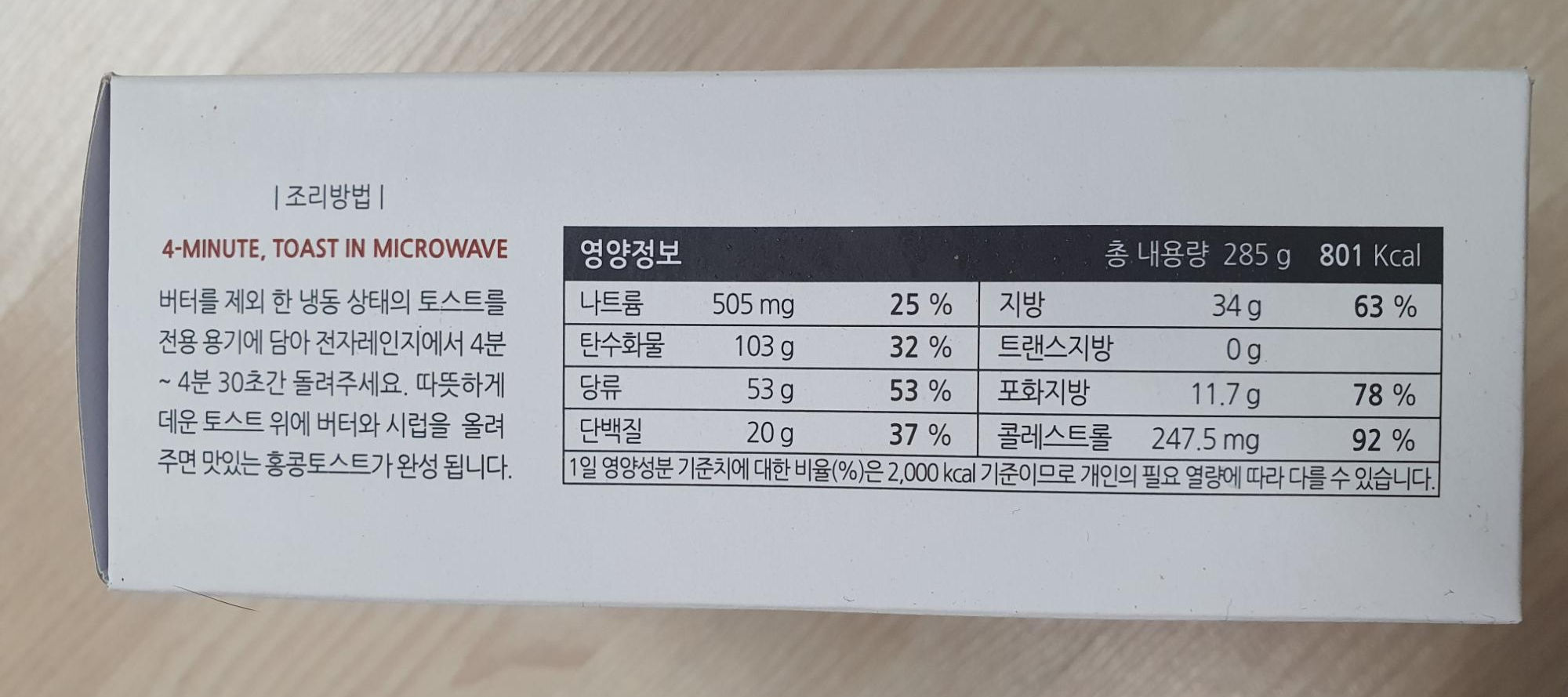 조리 방법은 버터를 제외한 냉동 상태의 토스트를 전자레인지에서 4분~4분 30초간 조리 후,