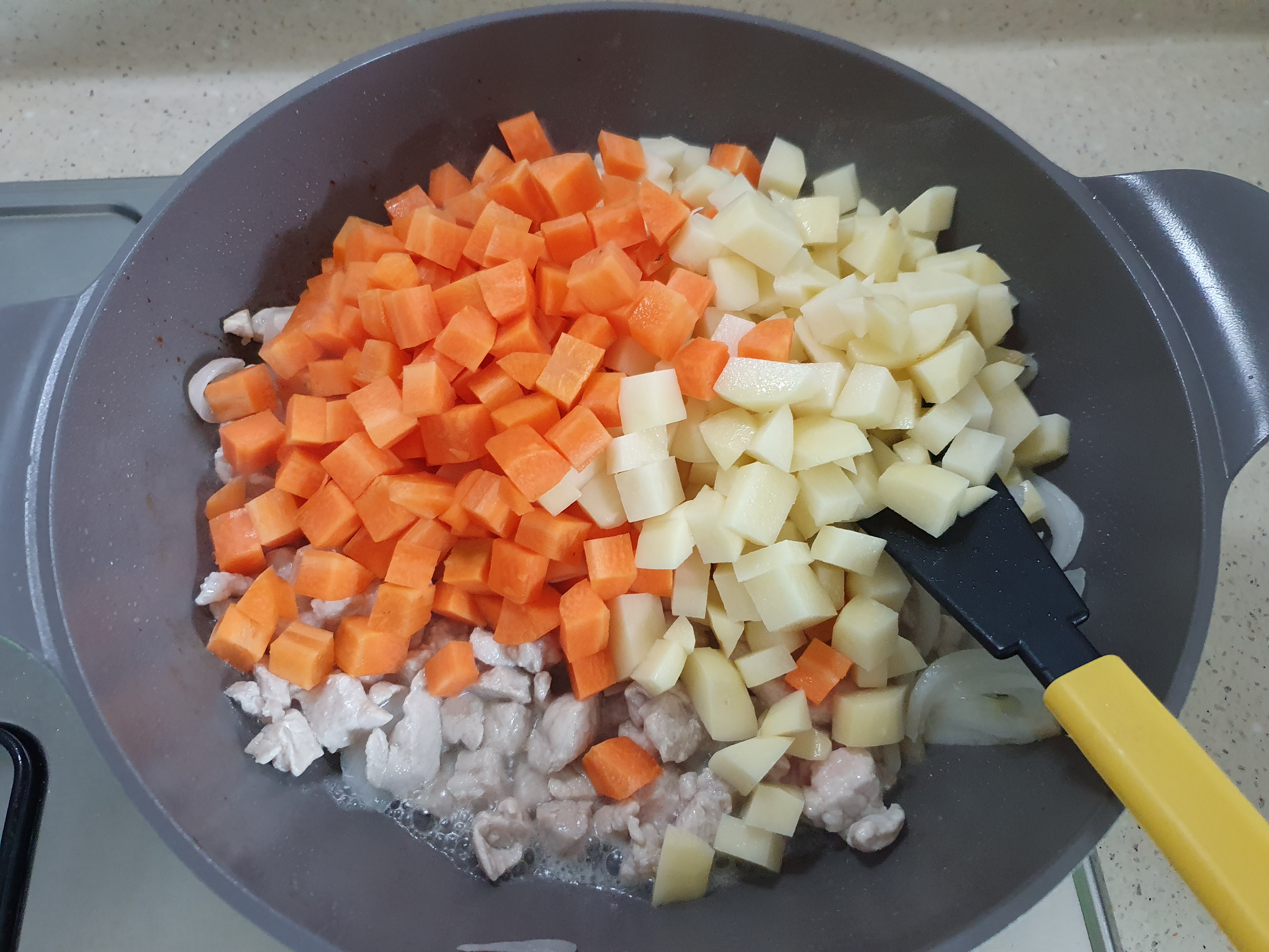고기가 다 익으면 깍둑 썰기한 당근과 감자를 넣고,
