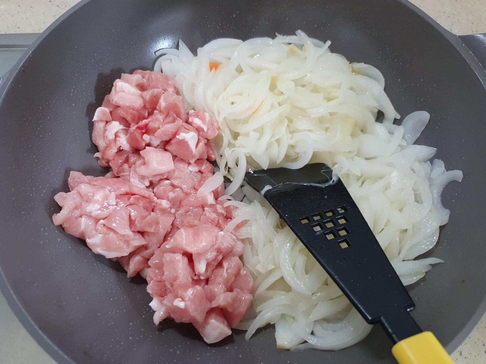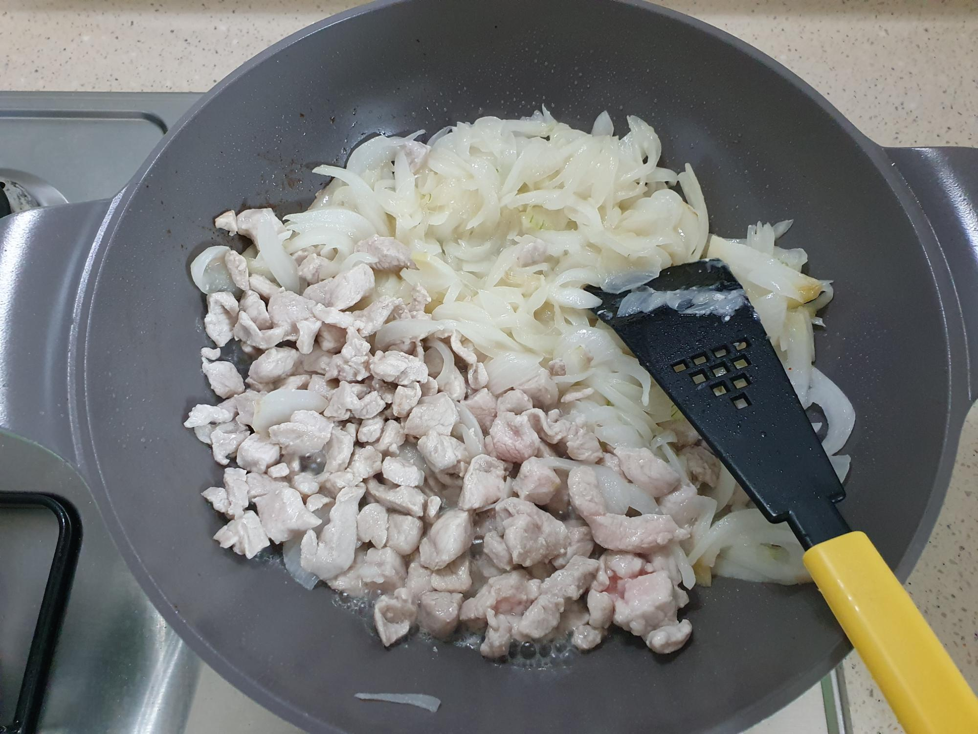 돼지고기를 넣어서 같이 볶아줍니다.