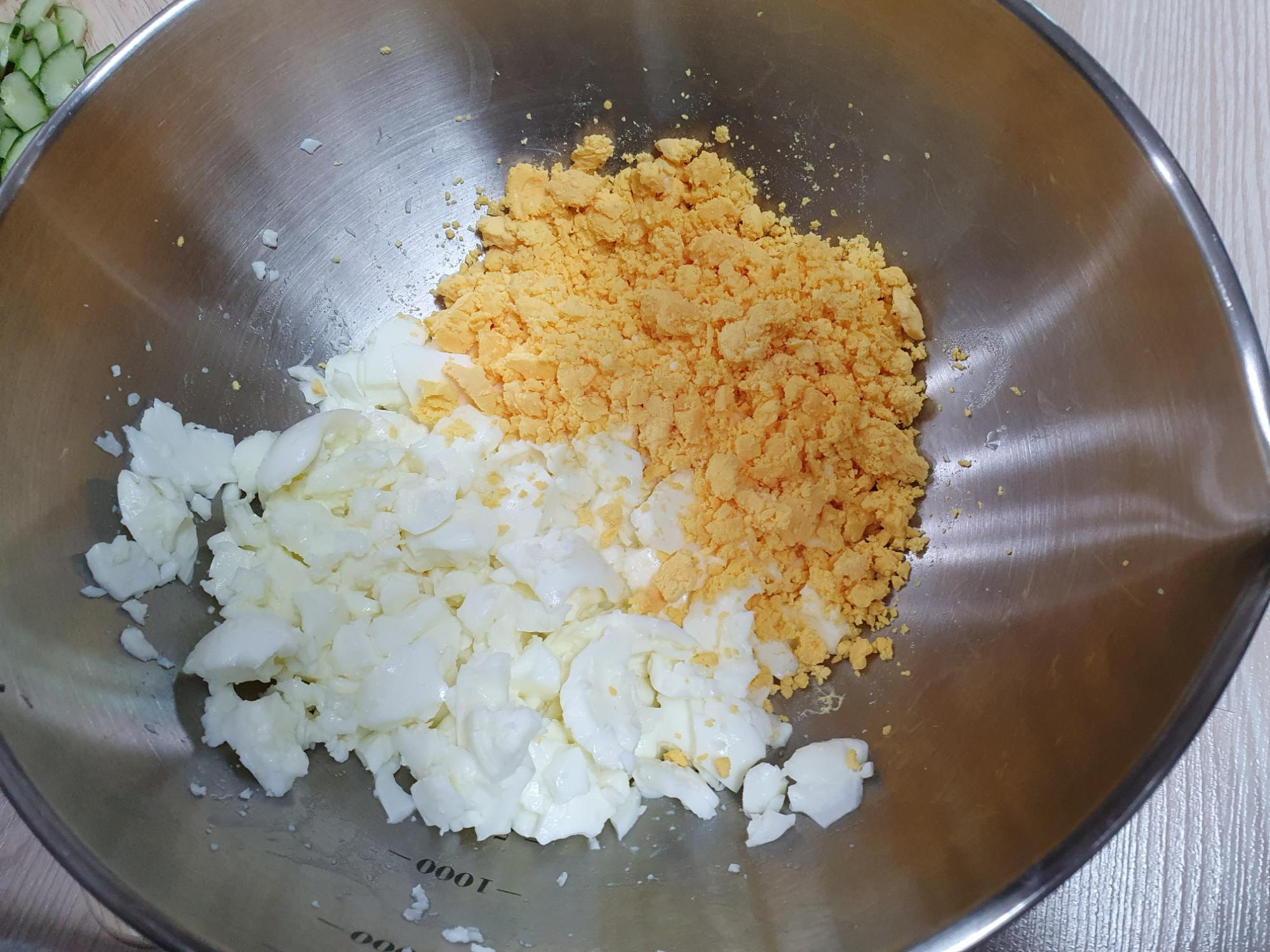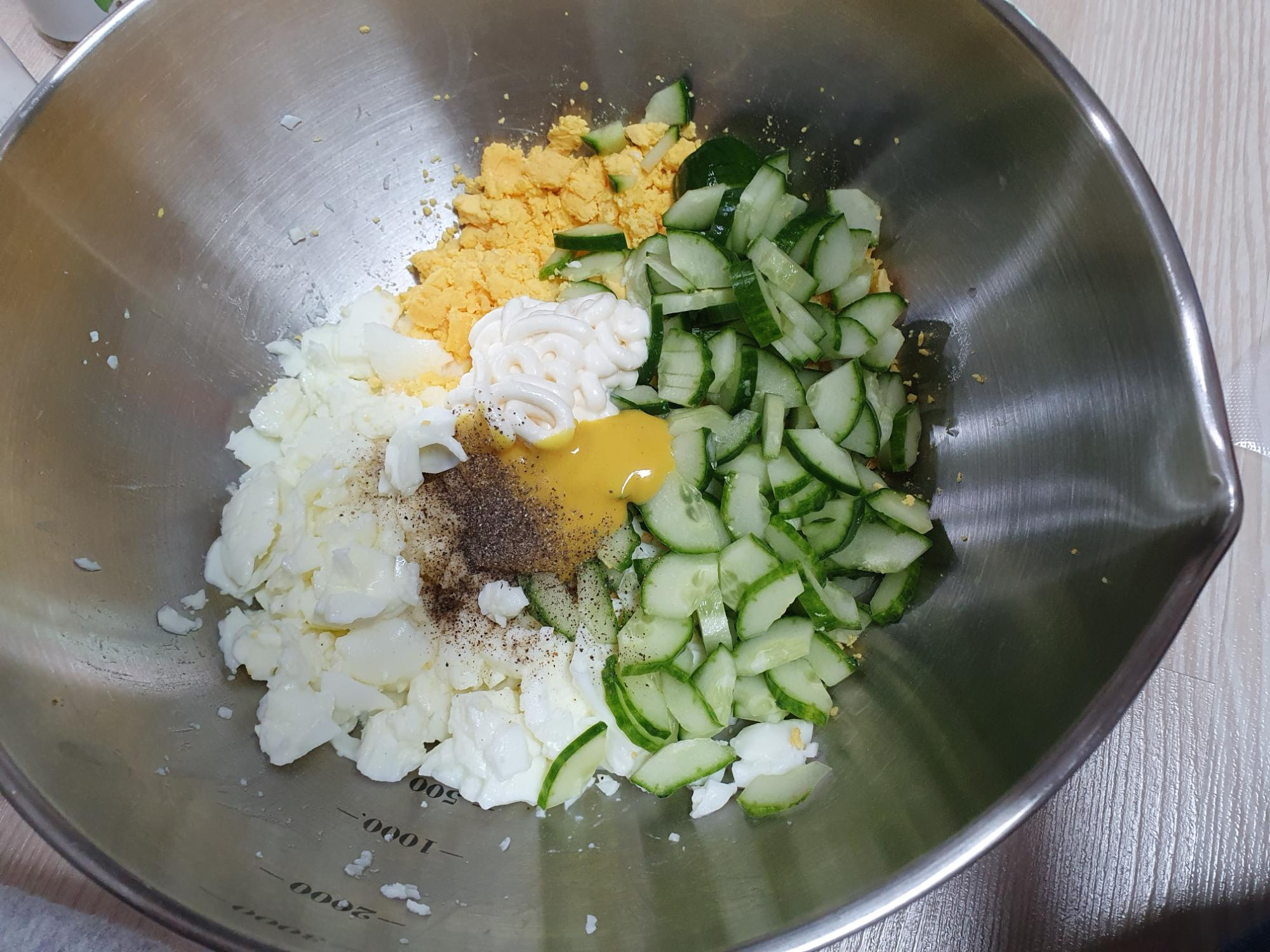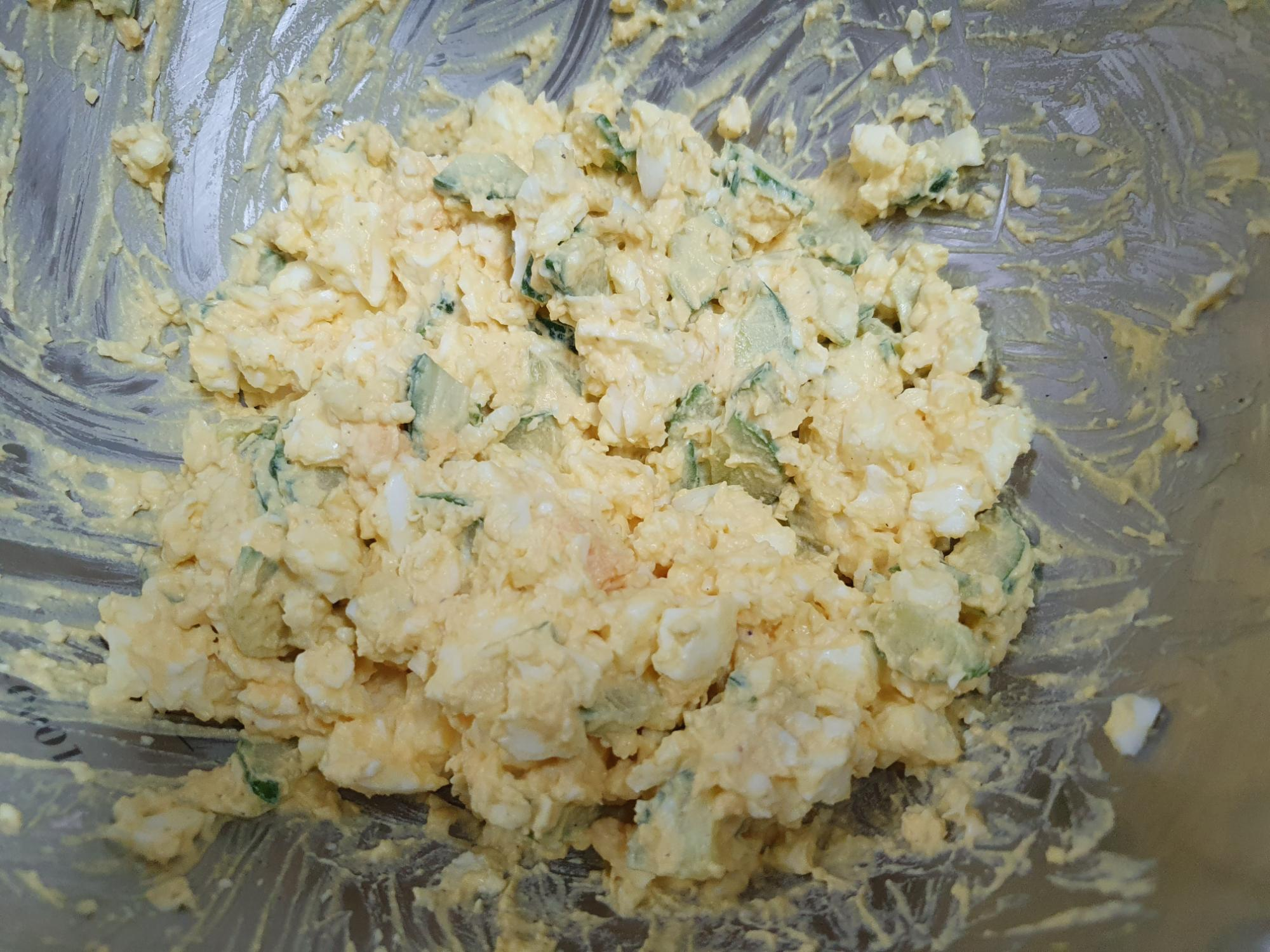 이제 잘 부서진 계란에 오이, 마요네즈, 허니머스터드, 후추, 소금을 넣고 잘 비벼주면 끝!입니다.