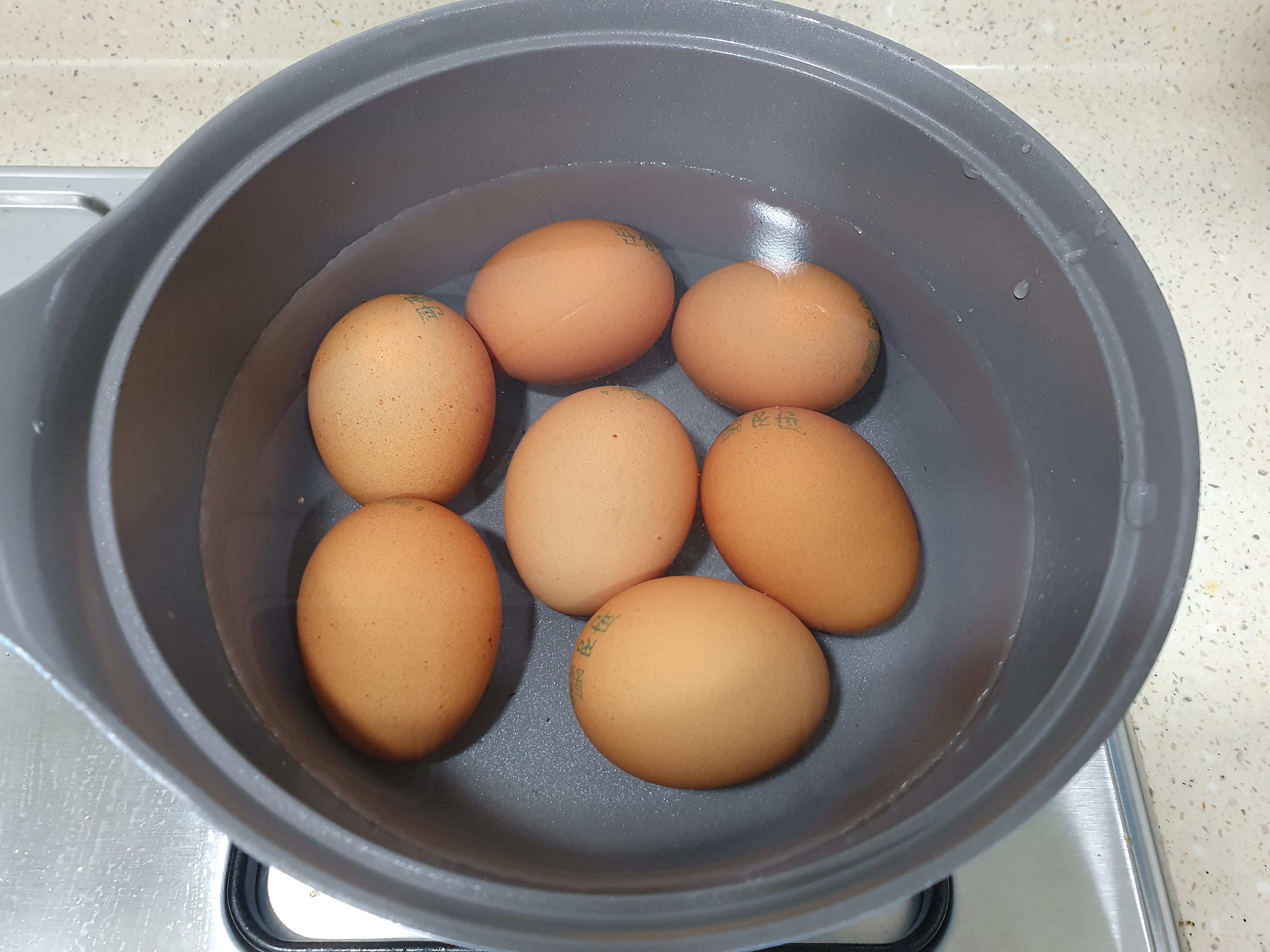 계란이 살짝 잠길 정도 물을 붓고, 굵은소금과 식초를 조금 넣은 후,