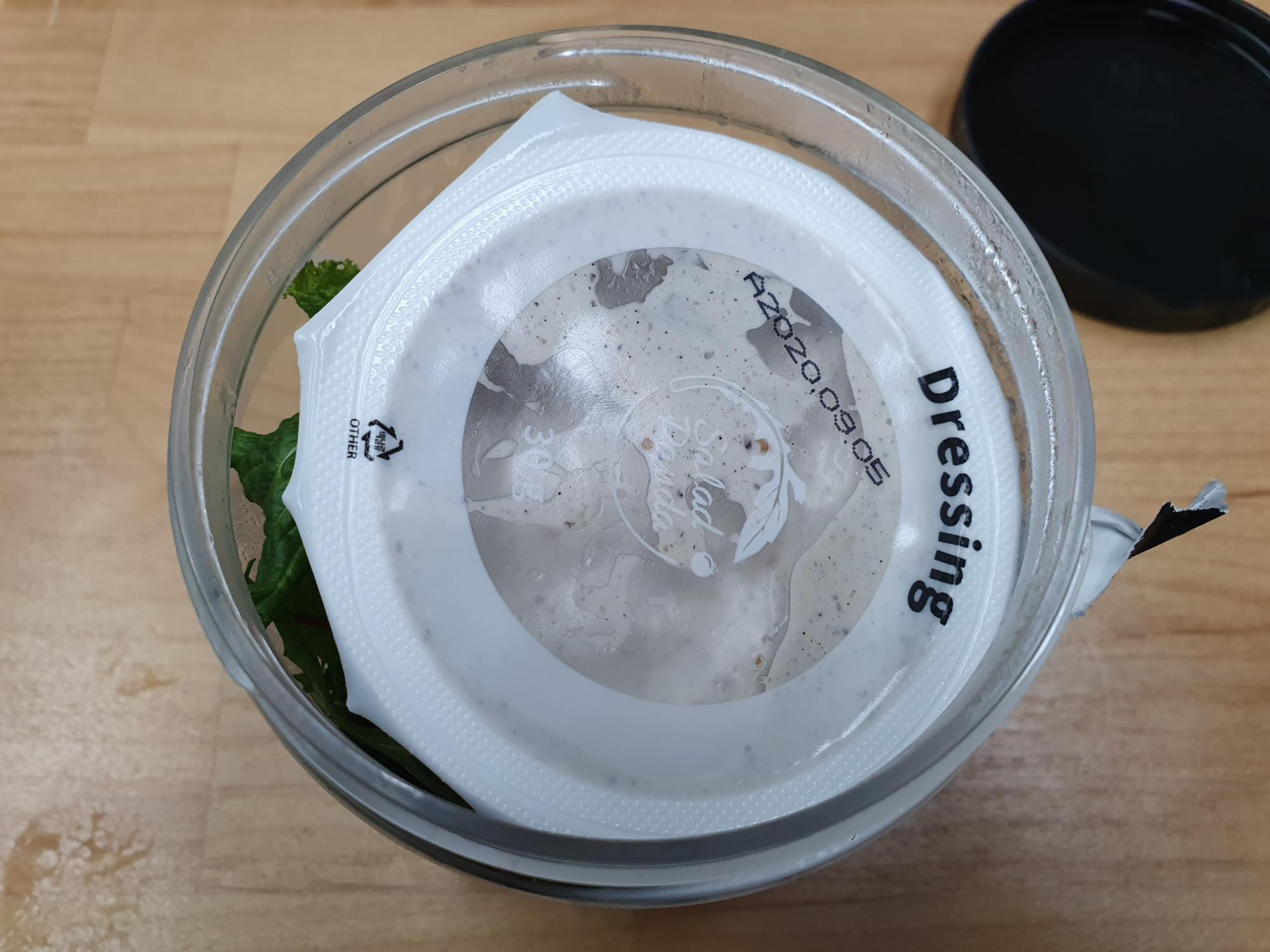 아주 싱싱한 샐러드 위에 드레싱을 뿌리고 다시 뚜껑을 닫아서,