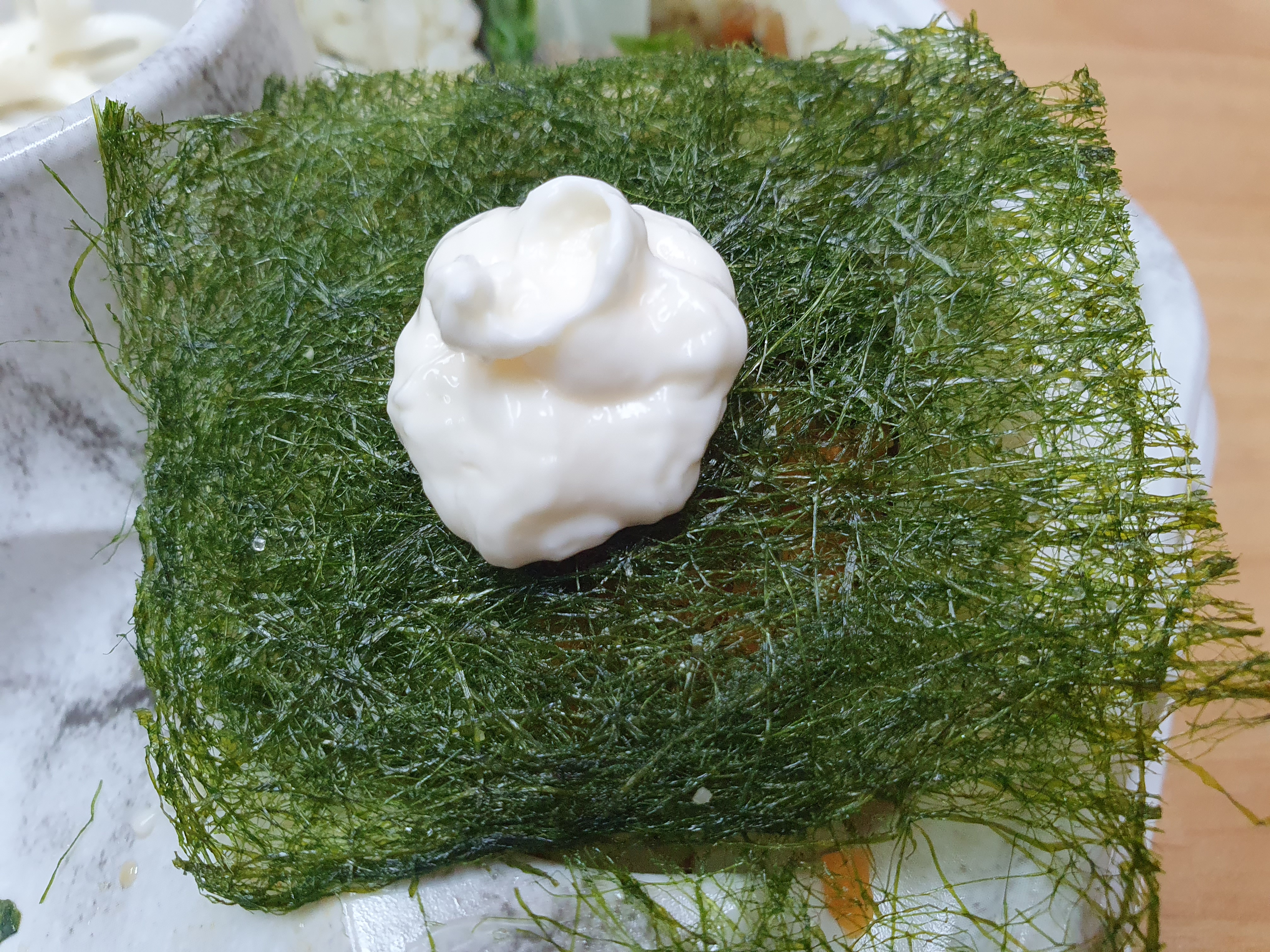 감태 한 장을 올리고 마요네즈를 올려서 먹어봤습니다.