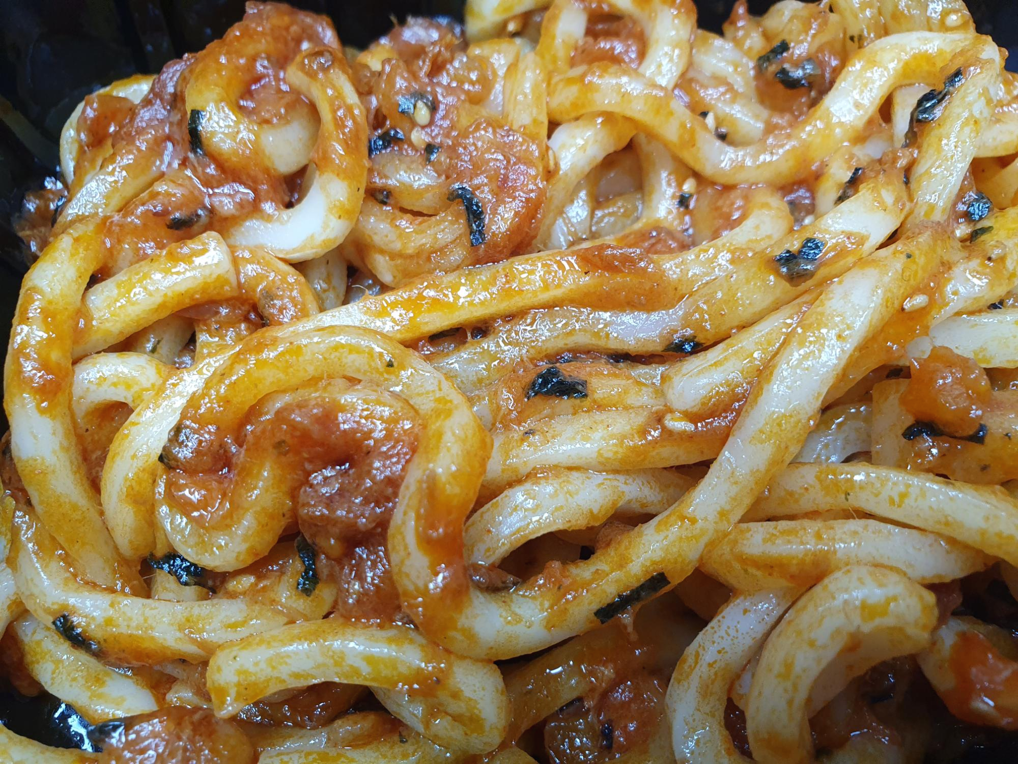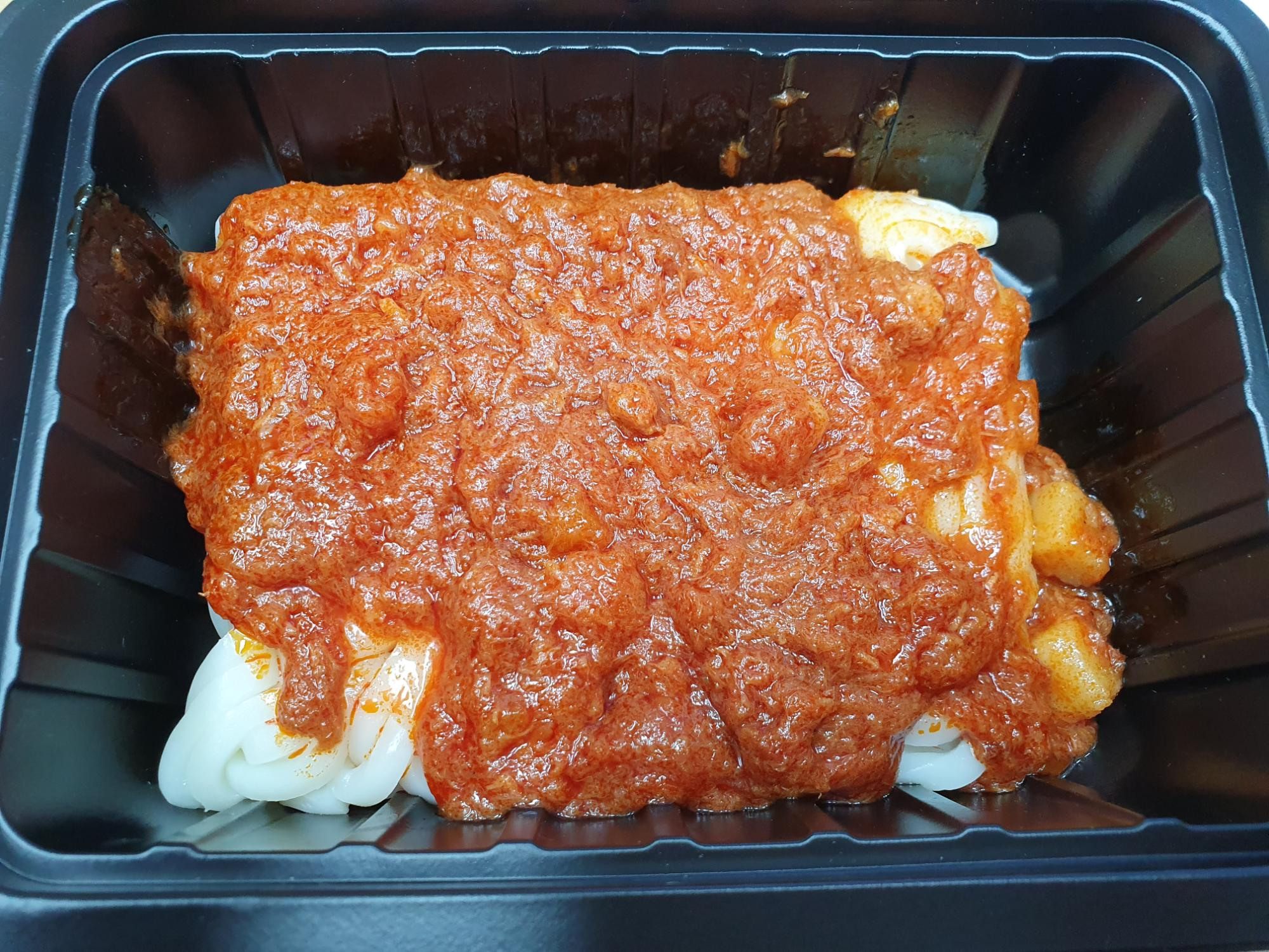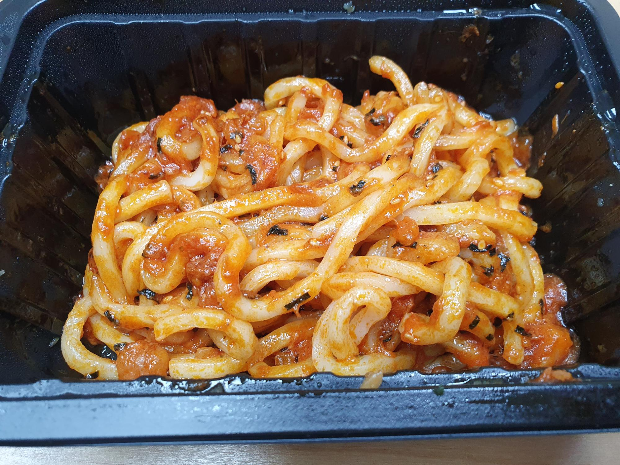 (고루 펴주는 게 중요해요~ 우동면이 소스에 젖지 않으면 전자레인지 조리 시 수분이 말라서 딱딱해집니다)