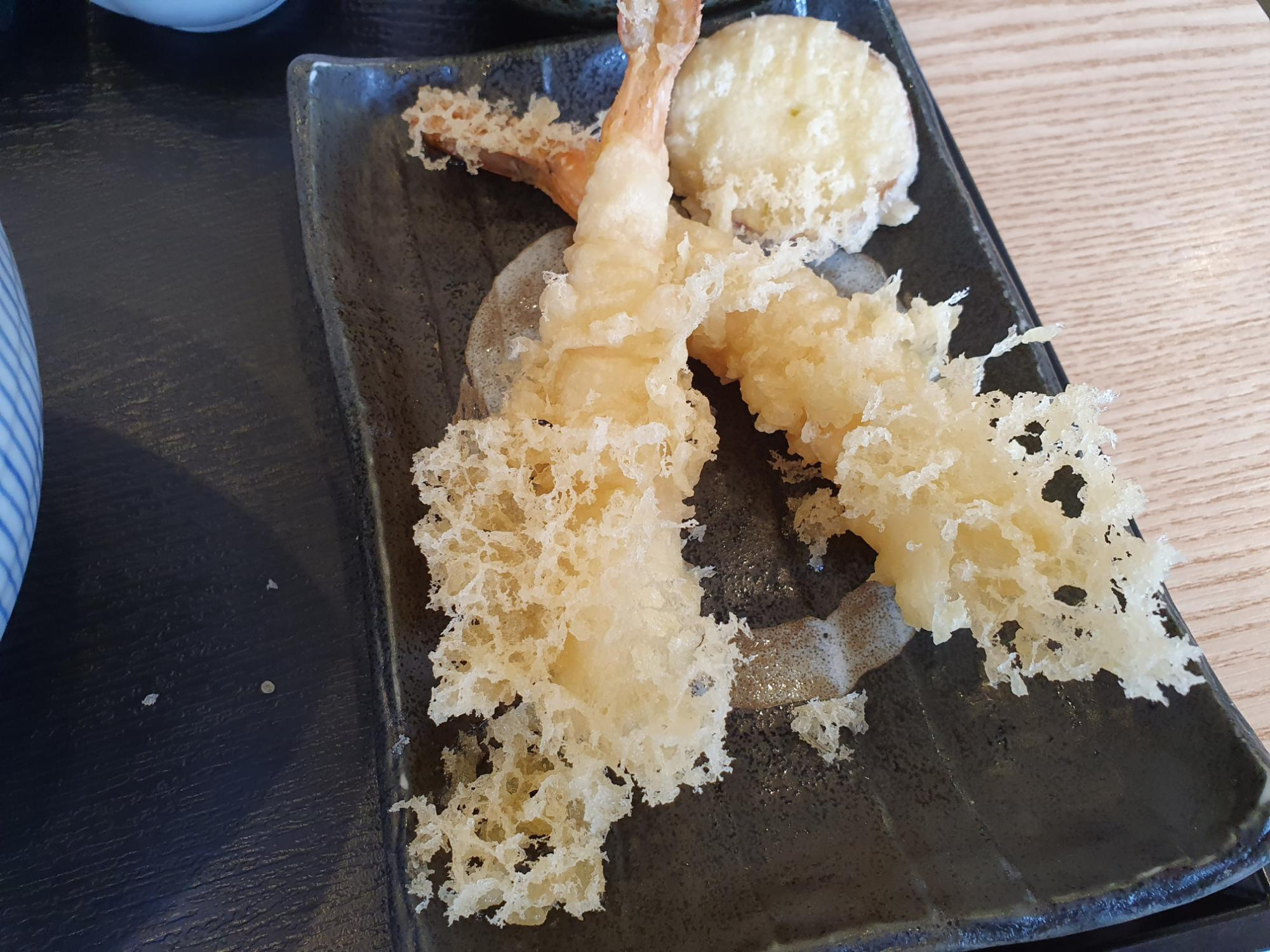 세트에는 새우튀김과 쯔유 밥이 함께 나옵니다.