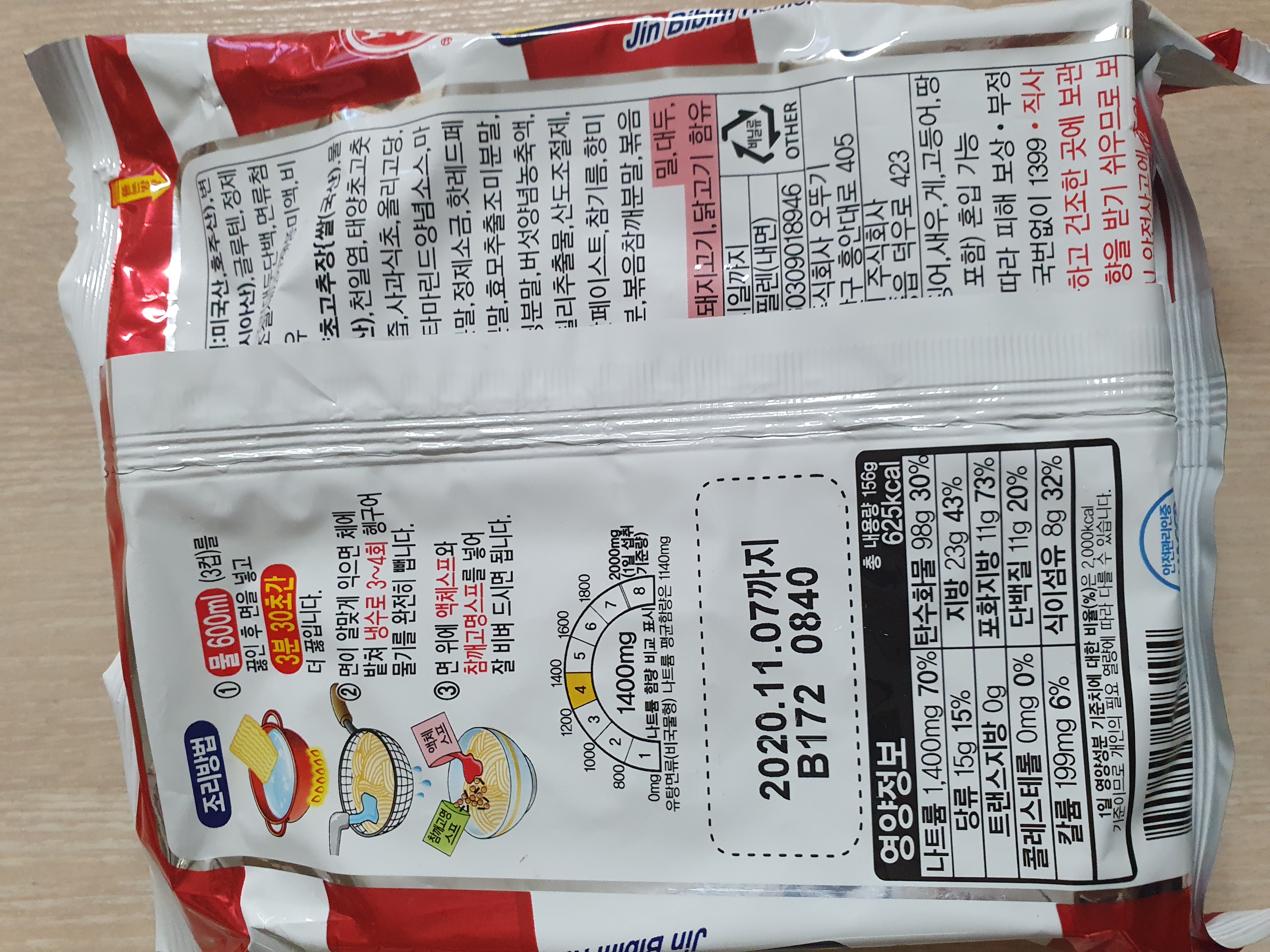 진비빔면의 칼로리는 625Kcal이고, 나트륨은 1,400mg (70%)으로 칼로리와 나트륨 함량이 조금 높은 편이네요~