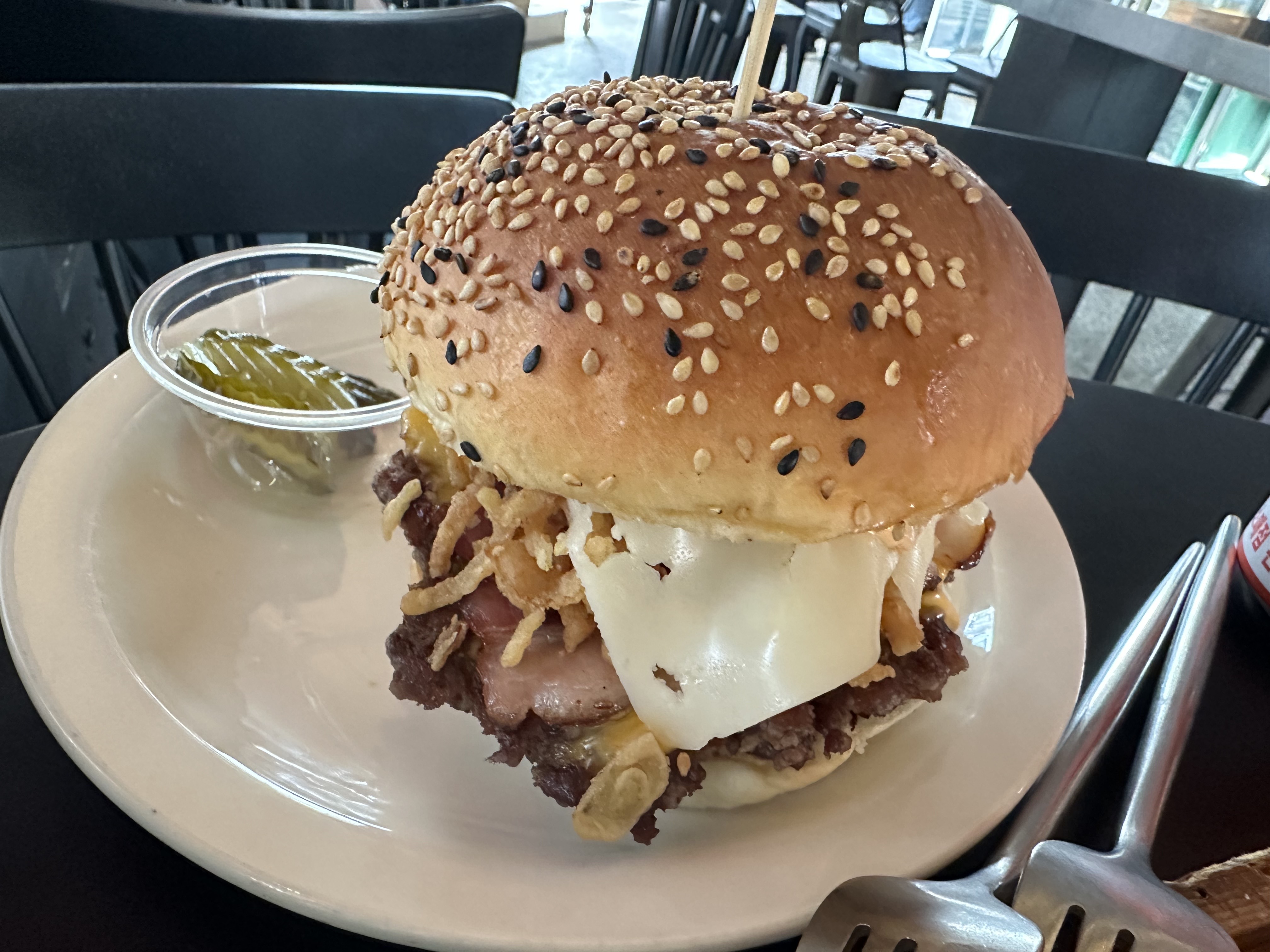 참깨번, 소고기 패티, 베이컨, 치즈, 고다치즈, 토마토, 양파 튀김, 양상추의 조합으로 이루어져 있습니다.