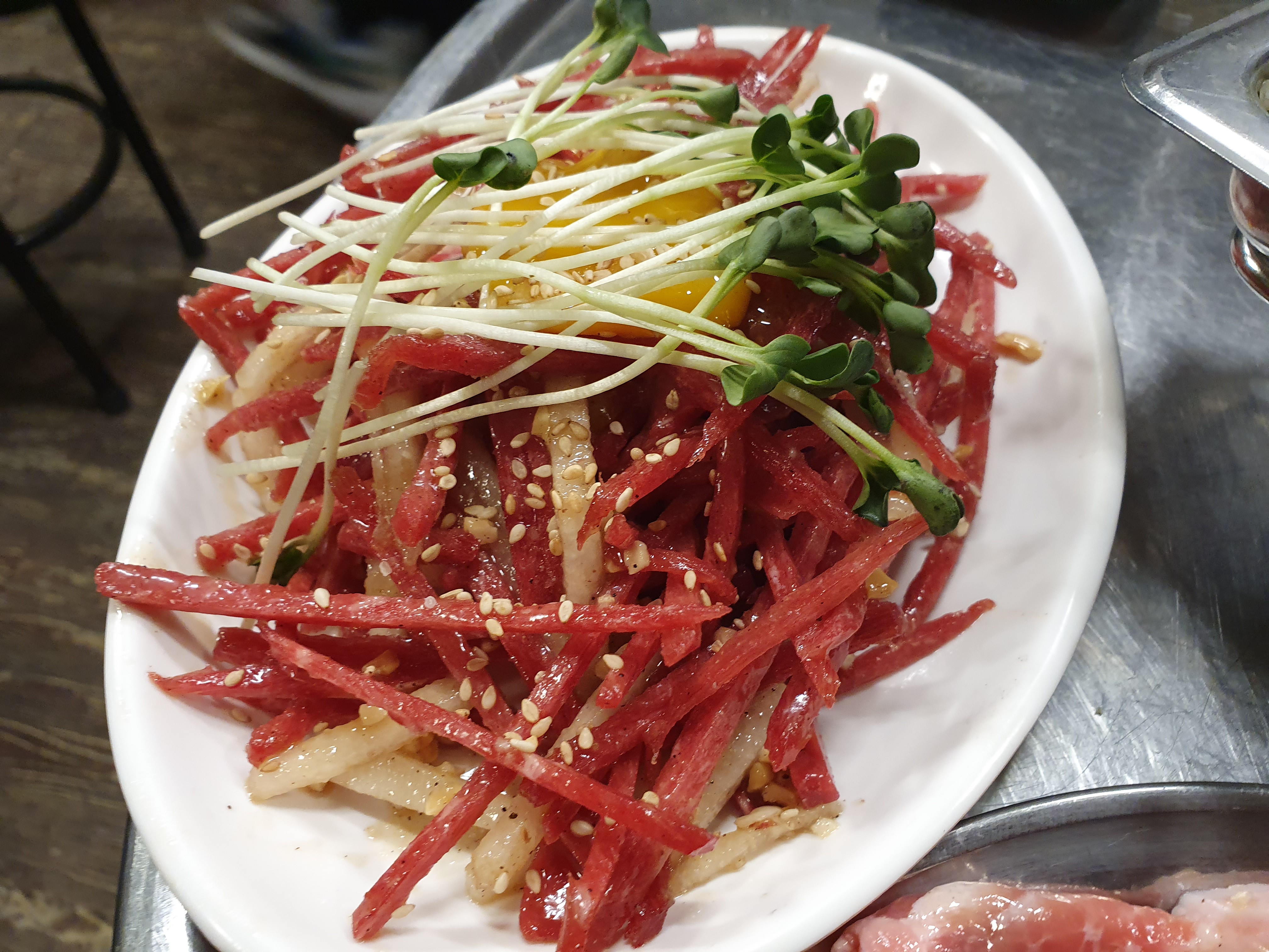 저기 밑반찬으로 준비되어있는 파절이를 소스에 버무려서 고기와 같이 먹으면 정말 꿀맛입니다! 육회는 냉동 육회고요~ 달짝지근하고 소금간이 되어있습니다. 노른자 버무려서 먹으면 맛있어요!