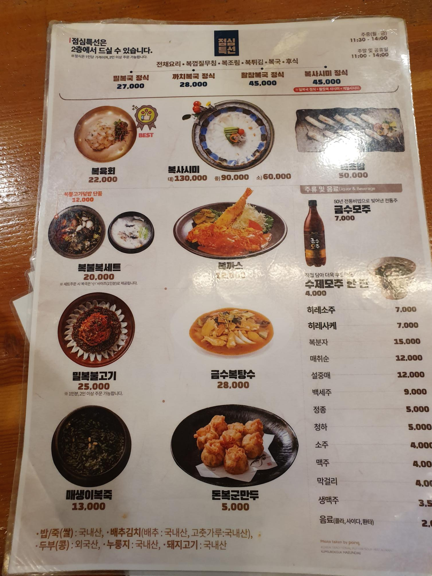 (활참복국 : 45,000원, 까치복국 : 20,000원, 밀복국 : 18,000원, 은복국 : 11,000원)