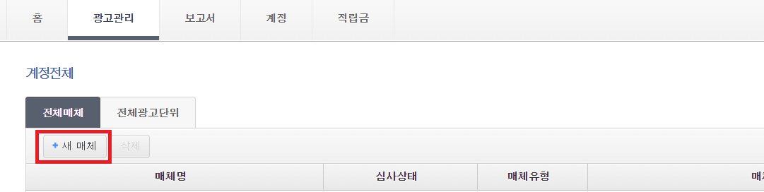 매체 등록이 완료된 후 매체 이름을 클릭하면 아래와 같이 새 광고를 추가할 수 있습니다.