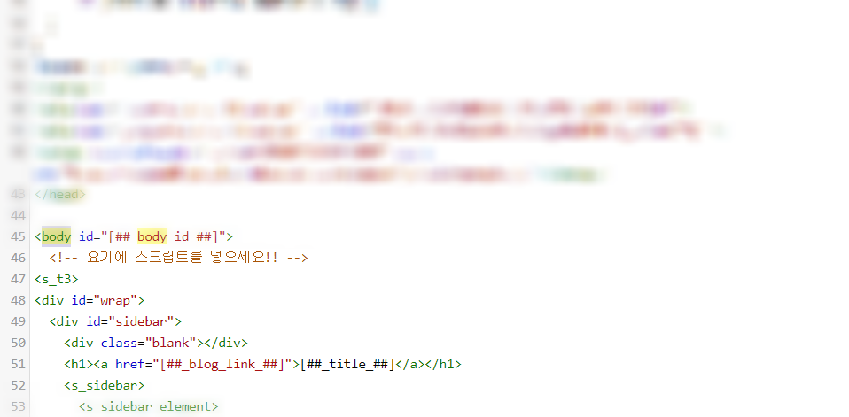 그럼 아래와 같이 <body>가 보입니다. 여기 바로 밑에 아까 복사한 스크립트를 넣고,