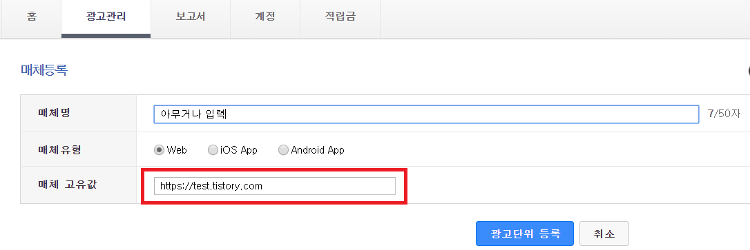 매체 고유값에 홈페이지 주소를 입력합니다.