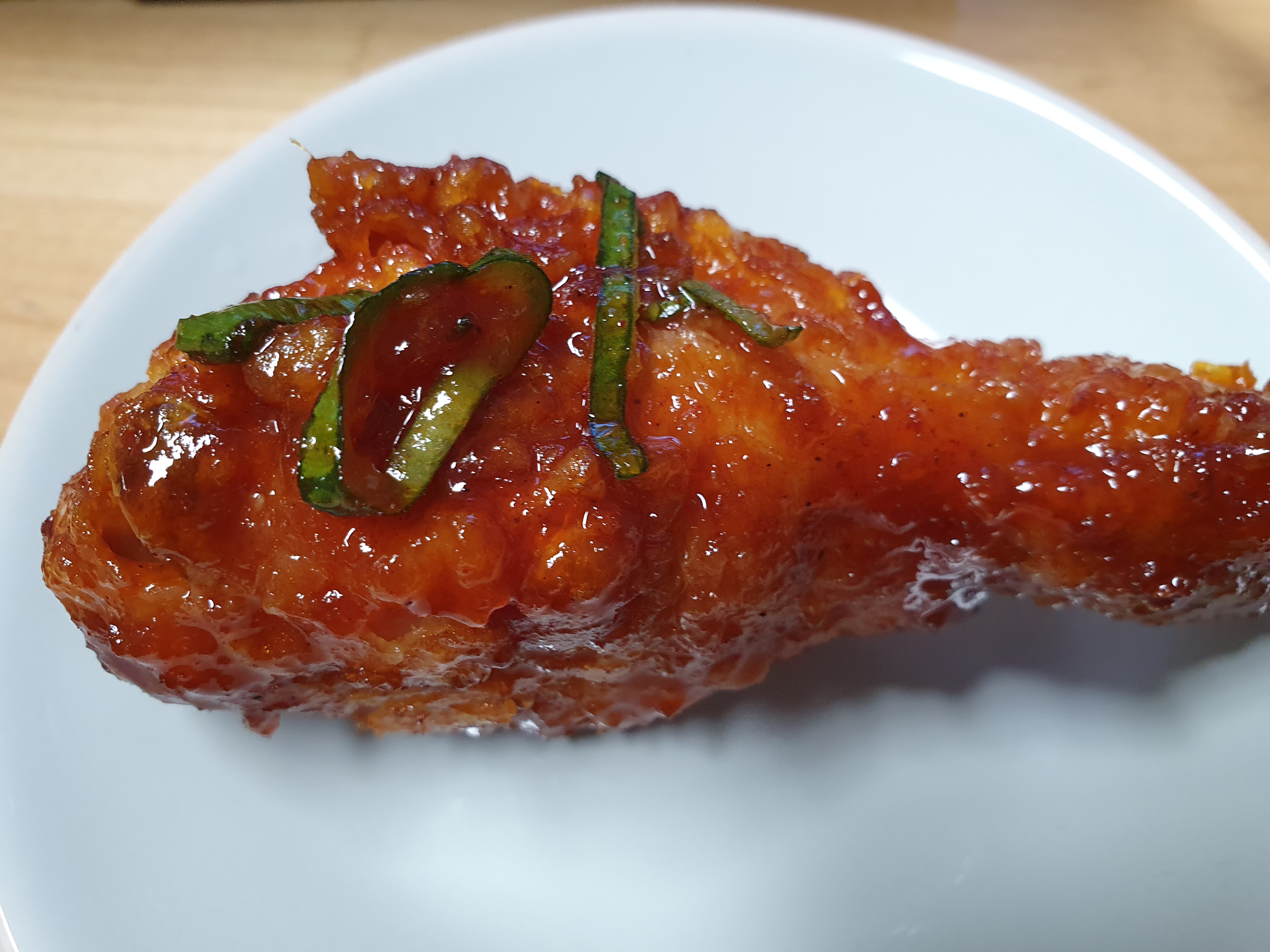 매운맛이 느껴지는 빨간 양념과 그 위에 파채가 약간 올려져 있습니다.