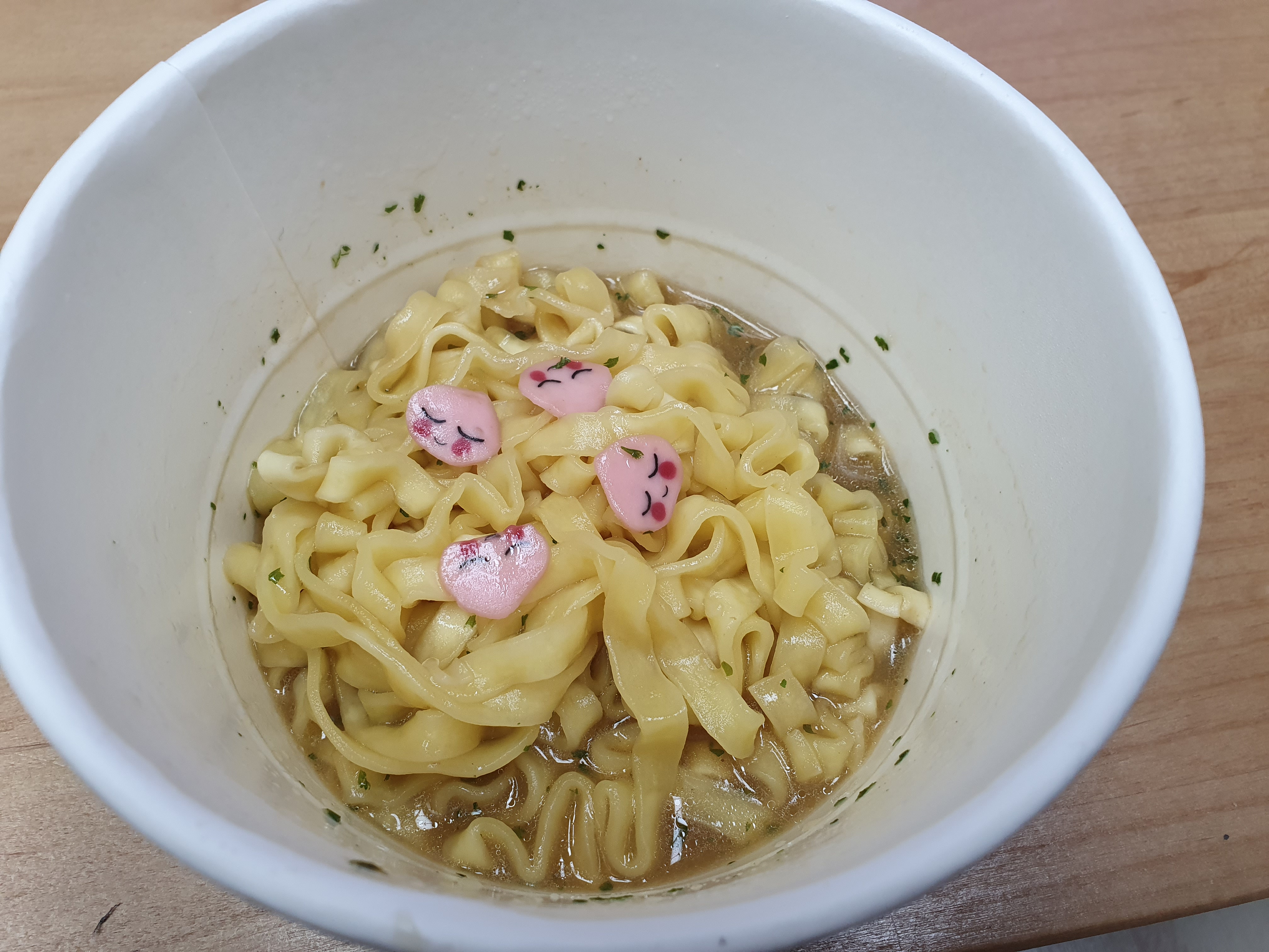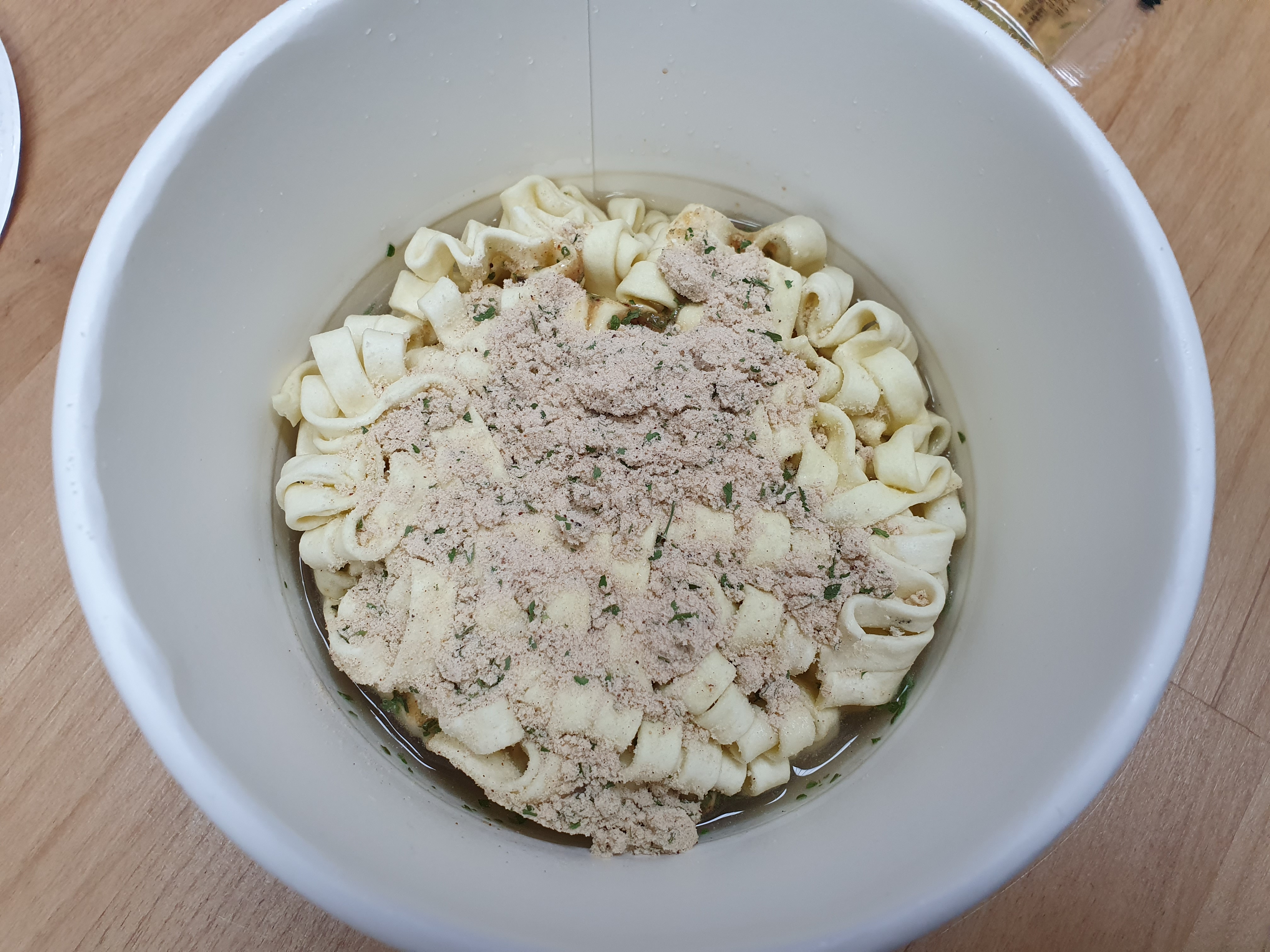 면위에 분말스프를 뿌리고 끓는 물을 표시선까지 붓고, 전자레인지에 3분 30초 돌렸어요~^^