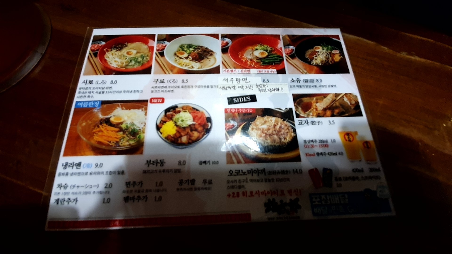 시로(8,000원), 쿠로(8,500원), 새우탕면(8,500원), 쇼우(8,000원), 냉라멘(여름 한정) 이렇게 있네요.