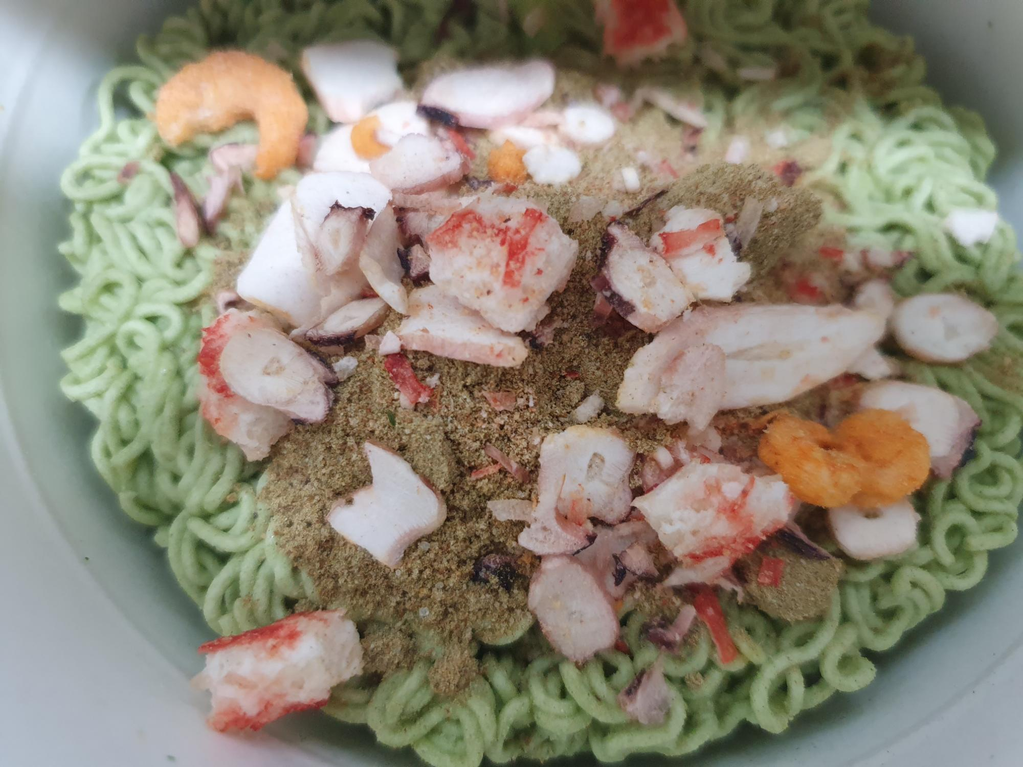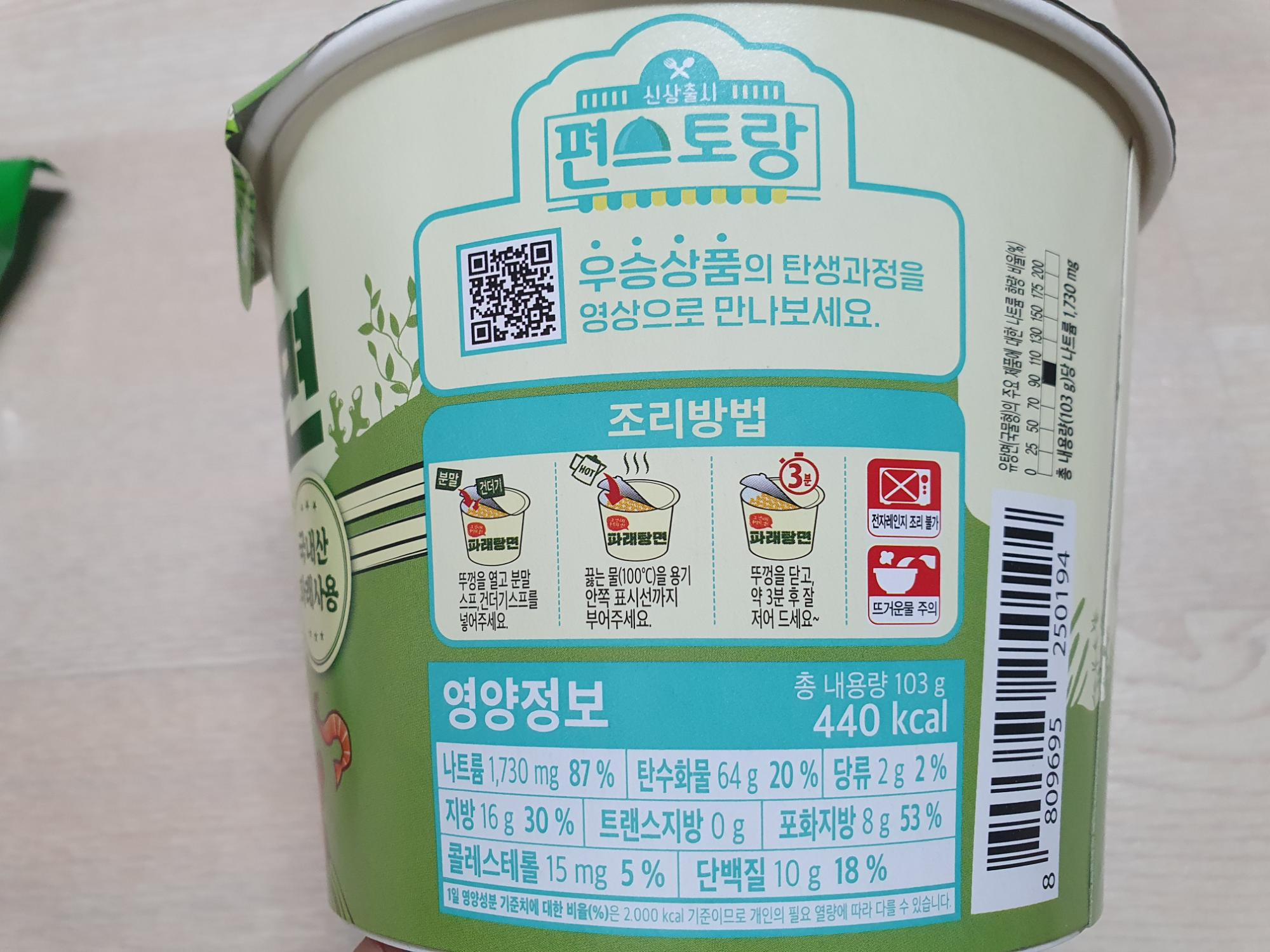 면에도 파래가 들어있고, 스프류중에는 오징어, 꽃게, 새우, 파래가 들어가 있다고 합니다.