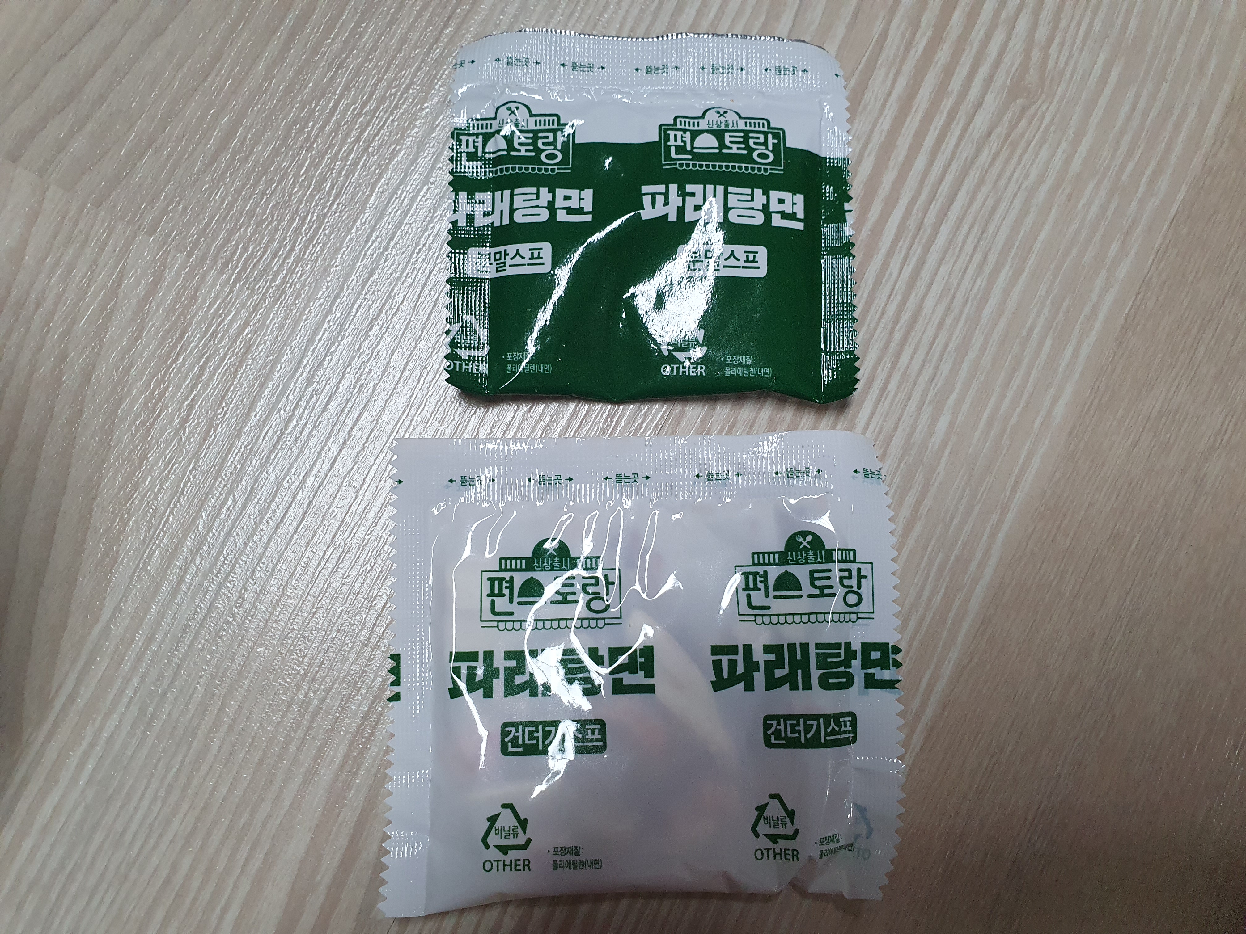 면은 초록색이고, 스프는 분말스프와 건더기 스프가 따로 있습니다.