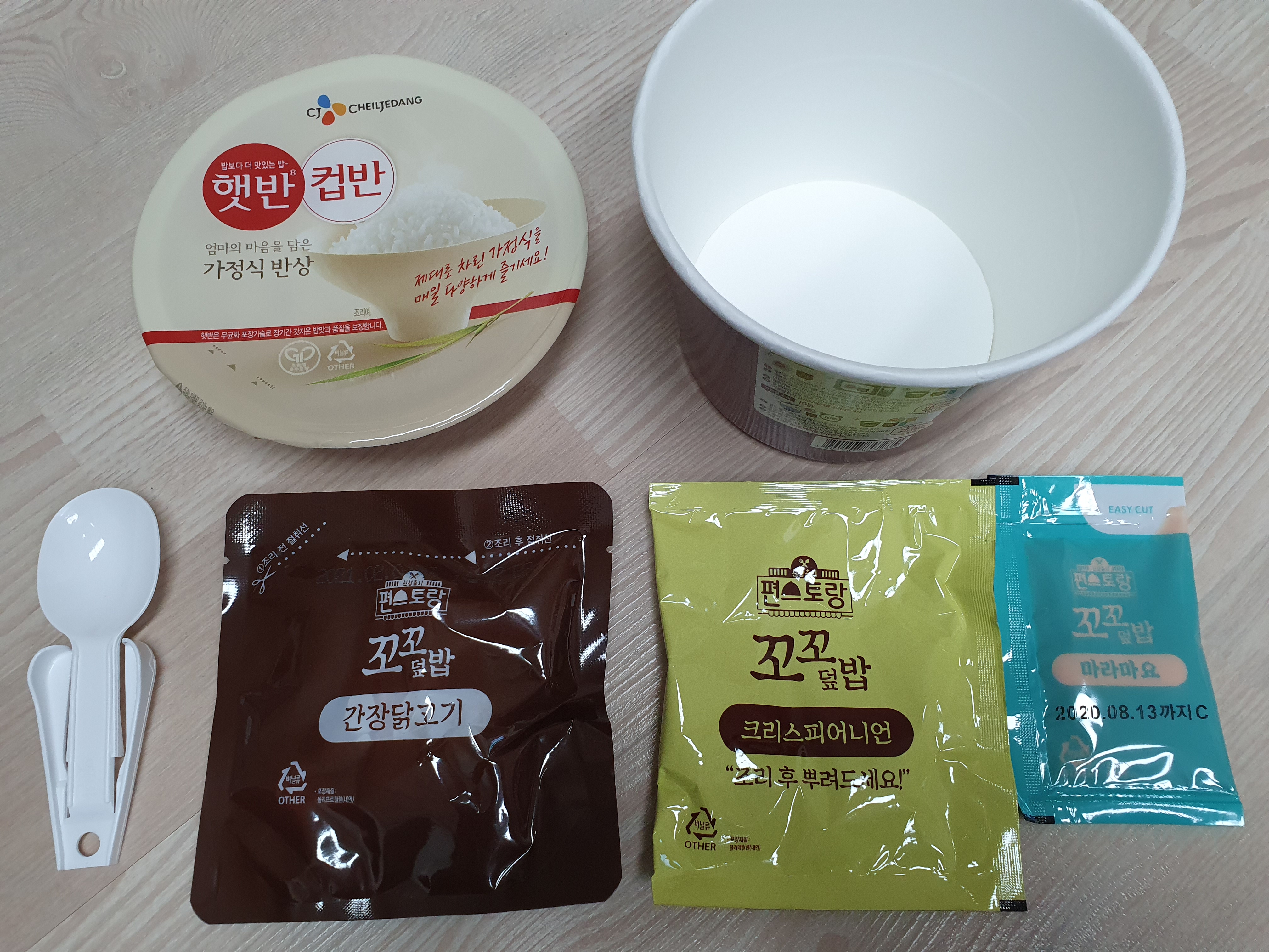 구성품은 햇반과, 간장닭고기, 크리스피어니언 그리고 마라마요가 들어가 있어요~